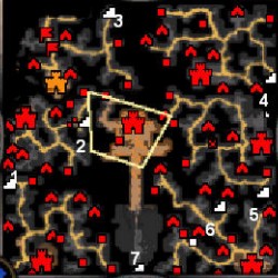 - Červené čtverečky na mapě povrchu i podzemí mapují většinou zdroje vojenských jednotek (vynímečně Doupě zlodějů, či Pevnost na kopci),