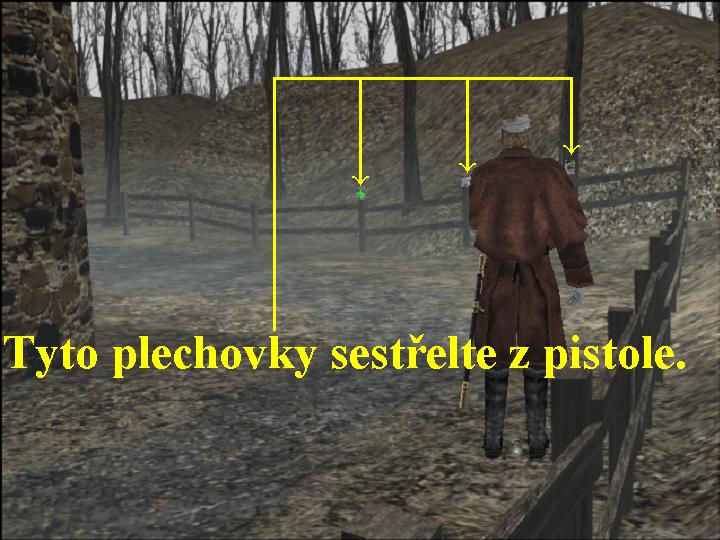 Jděte dopředu po cestě, sbírejte munici i červené „twany“, šavlí