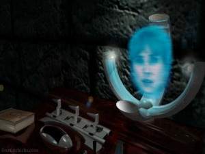 stolek a spínačem na něm spustíte hologram. Prohlédněte si knihu nalevo a
