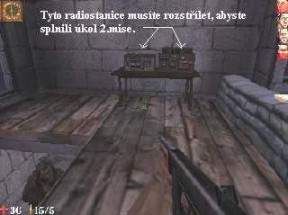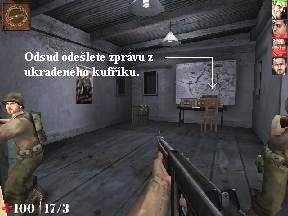 Hned na začátku udělte vašim kamarádům příkaz k následování a sledování cílů. Pak pokračujte opatrně dopředu. Vpravo nahoře na obrazovce máte podobizny všech členů družstva včetně vás, můžete si je tedy libovolně přepínat, koho chcete ovládat. Doporučuji nechat ovládání na č.1, to jste vy. Pokud totiž padne z některých vašich kamarádů, nemůže už sice nastoupit do další mise, ale hra pokračuje dál, pokud padnete ale vy sami, mise končí. Můžete ale soustavně přepínat mezi postavami a tak se velmi opatrně dostávat vpřed. Nepřátel je hodně a někteří na vás pouštějí i psy. Dostanete se až k malému domečku na levé straně, vstupte do něj a seberte lékárničky. Můžete hned ozdravit sebe a vaše kamarády, abyste si uvolnili místo ve vašem inventáři. Pokračujte kolem vysokého domu na pravé straně přes křižovatku rovně, mezi dvěma vysokými domy dále rovně dopředu. Na další křižovatce doprava, na další křižovatce doleva. Vstupte do domu před vámi a celý ho prohledejte, je tam spousta užitečných věcí i ve sklepě. Vaším prvořadým úkolem je však zastřelit hauptmana Strause a jeho pobočníka a ze stolu sebrat kufřík s tajnými dokumenty. Běžte tedy po schodech z přízemí doprava nahoru, kolem toalety vpravo a zastřelte oba nacisty. Seberte ze stolu kufřík a vyjděte zpět před dům a vracejte se po cestě, odkud jste přišli zpět. Na první křižovatce zatočte doprava, pokračujte rovně, na další křižovatce opět rovně mezi dvěma zídkami dále, na křižovatce doprava. Po cestě mezi dvěma ploty dopředu. Za kulometném hnízdě vejděte vlevo do domečku a zde odvysílejte vysílačkou vašemu ústředí zprávy, které jste získali sebráním tajných dokumentů v kufříku. Vyjděte ven a vlevo si nasedněte do terénního automobilu. Jeďte v něm po cestě zpět a zatočte na druhou cestu vlevo. Nebojte se o kamarády, budou vás sami následovt, zřejmě jim jejich nohy slouží více než dobře. Jeďte po cestě dále dopředu, fašisty, kteří po vás střílejí a stojí vám v cestě, srážejte autem a tak ušetřte práci a zdraví vašim kamarádům. Tímto způsobem jízdy se dostanete až na konec této mise. Konec první mise.