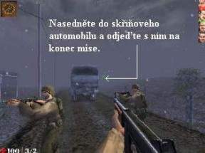 Tady vás čeká opět důležitý úkol, zničit nacistická skladiště pohonných hmot a tak ochromit německé motorizované síly. Těchto skladů je celkem pět, z toho tři jsou v jižní části a dvě skladiště jsou v severní části. No, skladiště, zprvu mne to také mátlo, zřejmě jste dostali od svého vedení nepřesné informace, fašisté jsou zřejmě zcela bezstarostní a uskladnili svoje zásoby pohonných hmot na úplně volných prostranstvích, takže nehledejte žádné sklady, ale jen se pořádně rozhlížejte kolem sebe, pohonné hmoty jsou skladovány v železných barelech na velkých hromadách. Jděte tedy rovně po cestě dopředu, po stranách likvidujte fašisty. Přejděte přes most a pokračujte dopředu. Za zatáčkou zlikvidujte německý tank a vlevo za ním kulometčíka. Pokračujte po klikatící se cestě dál. Po stranách je spousta fašistů a psů, tak si dávejte dobrý pozor a buďte ve střehu. Přejděte přes můstek, dostanete se na křižovatku s nákladním autem, raději ho zničte, není vám nyní k ničemu. Pokračujte dále rovně až na další křižovatku. Vlevo zlikvidujte tank a kulometčíka. Kolem drátěného zátarasu pokračujte rovně dopředu. Na křižovatce vpravo zničte další tank, ale pokračujte opět rovně dopředu. Před velkými domy zabočte doleva. Jděte po cestě rovně, až příjdete ke kulometnému hnízdu, seberte pancéřovou pěst a zastřelte kulometčíka. Pokračujte dále a mezerou v plotě dojděte k nákladnímu autu. Od něj vlevo vidíte na sobě naskládány barely s pohonnými hmotami, hromady jsou tři, to je onen již zmíněný jižní sklad pohonných hmot fašistů. Rozstřelte je pomocí pancéřové pěsti, nebo k nim položte nálož. Tím pro vás na tomto místě váš úkol skončil, pro jistotu však ještě zničte nákladní auto s naloženými barely a můžete se vrátit zpět. Abych nezapomněla, v troskách barabizny po schodech nahoru leží pancéřová pěst, vemte si ji sebou na další cestu k severnímu skladišti pohonných hmot, bude se vám určitě hodit. Vyjděte z ohrady ven, dejte se doleva a pokračujte po cestě zpět až na křižovatku s drátěným zátarasem doleva. Potom po cestě pořád rovně dopředu, až narazíte na další fašistický tank, který samozřejmě také zlikvidujte. Pokračujte kolem něj dopředu a zabočte do ohrady vlevo k nákladnímu autu. Od nákladního auta vlevo zlikvidujte navršené barely s pohonnými hmotami, jděte dozadu za nákladní auto a vlevo za ním je poslední hromada barelů s pohonnými hmotami, zlikvidujte ji také. Teď jste tedy zcela splnili vám zadané úkoly pro tuto misi. Nyní již můžete pro zpáteční cestu použít nákladní auto. Připomínám znovu, dbejte opravdu pečlivě na to, aby s vámi nasedli společně i všichni vaši kamarádi, jinak o ně příjdete. Nasedněte všichni do nákladního auta a kolem zničeného tanku ujížděte dopředu, před dalším vyhořelým tankem zabočte kolem kulometu doleva a pokračujte vpřed. Kolem trosek nákladního auta doprava a pořád vpřed po klikatící se cestě. Kolem vás po vás střílejících fašistů si nevšímejte, pokud pojedete rychle, nemohou vám vůbec nic udělat, jestli se vám ale stavějí do cesty, tak je bez zastavování srazte tak, že do nich bez milosti najedete. Přejeďte přes most a zastavte si, vystupte a zničte před vámi fašistický tank, pobijte fašisty v okolí. Nastupte si a dojeďte až na konec mise.