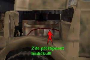 Jděte dopředu, zatočte doleva, zastřelte nepřátelského vojáka a mechanika. U náklaďáku přestřihněte přívod benzinu (viz obrázek), červenou hadičku klávesou E, je to jednou pro vždy klávesa „akce“. Běžte k druhému náklaďáku a udělejte totéž. Vyjděte vraty za tímto náklaďákem na nádvoří, zastřelte vojáka a mechanika, vejděte vlevo do dveří, seberte lékárničku a přeštípněte hadičku u třetího posledního náklaďáku. Vyjděte velkými otevřenými vraty na nádvoří, dejte se doleva a zahněte vlevo do prvního boxu s tankem. Z druhého boxu vyjede tank, ten nechte prozatím na pokoji. Na první tank zezadu připevněte nálož. Přeběhněte do boxu, z kterého vyjel tank. Nenechte se zachytit strážným reflektorem, to by byl váš konec. Raději ho ve vhodnou chvíli z dálky zničte i se strážným (vždy nejdříve strážného) na věžičce. Utíkejte k dalšímu tanku, do cesty se vám postaví voják a mechanik, oba zlikvidujte. Na tank zezadu opět připevněte nálož. Vejděte do otevřeného skladu, zlikvidujte mechanika a seberte mu lékárničku. Jděte do dveří vlevo a opět doleva, uvidíte třetí tank. Zlikvidujte strážného i světlomet na věžičce a dva vojáky včetně mechanika. Na tank přiložte nálož. Obejděte tank, přímo mírně vlevo před vámi je za sudy s benzínem schovaný nepřítel. Střelte do sudů a tím zlikvidujete i jeho. Že to byl nádherný výbuch? Běžte na místo výbuchu a odtud zničte další světlomet i se strážným na věži. Potom položte nálož na poslední tank. Vraťte se do skladu a na místo za bednami, blikající červeně, položte nálož. Za 15 sekund to bouchne. Po výbuchu se ze skladu vyhrnou nepřátelé, všechny postřílejte. Tím se vám otevřely dveře za mřížemi. Vyběhněte po schodech do místnosti, kde pozabíjejte všechny nepřátele a potom otevřte růžové dveře. Za nimi zastřelte vojáka, dejte se doprava, zastřelte mechanika a vlevo už na vás čeká váš přítel, který vás odveze v džípu do dalšího levelu.