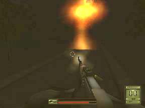 Jděte od výtahu rovně, před vámi vpravo spatříte obrovský výbuch.