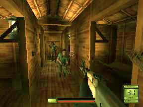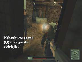 dopředu a hned doprava, za zídkou vlevo jsou první dva nepřátelé. Opatrně