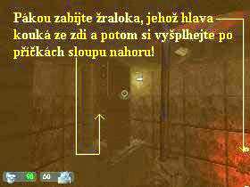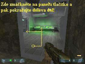 Nyní se nacházíte v tréninkové části hry, určitě se vám ukázaly vlevo dole dva ukazatele, množství zdraví či energie a ochranné brnění. Je to tak? Pak je vše v naprostém pořádku, můžete pokračovat vpřed do dveří, za nimi si nastupte do výtahu. Pomocí tlačítka vlevo sjeďte dolů. Dole si vystupte, pokračujte po lávce vpřed, sejděte po schodech až dolů. V místnosti si promluvte s operátorem a dalšími dveřmi naproti jděte dál.Skočte na potrubí, pokud se netrefíte, dole je žebřík, po kterém si vylezte zpět nahoru na původní místo. V dalších sekcích jsou tyto žebříky všude, takže na ně nezapomeňte v případě nouze. Po rouře pokračujte vpřed a na konci si vyskočte na výklenek. Otočte se doleva, rozběhněte se, na konci se odrazte a přeskočte si tak do chodby. Pokračujte chodbou dopředu, vyskočte si na potrubí a na konci seskočte dolů na další. Skrčte se a plazte se dopředu (levý Ctrl+kurzor vpřed), na konci seskočte doleva na příčnou rouru, znovu se rozběhněte, odrazte se a přeskočte tak do chodby, skočte přes další dvě roury a jděte dál do chodby. První rouru podlezte, druhou přeskočte s rozběhem, pokračujte po schodech nahoru, kde opět s rozběhem přeskočte do protější chodby. Jděte dál, projděte dveřmi a po drátěném pletivu si přešplhejte na druhou stranu. Po kovových nosnících na sloupu vyšplhejte nahoru, skrčte se a plazte se dopředu, na konci opatrně sešplhejte dolů a pokračujte chodbou vpřed. Nyní se musíte rozběhnout, odrazit se a doskočit až na žebřík před vámi. Po něm vylezte nahoru a pokračujte opět chodbou dál, projděte dveřmi, vystoupejte po schodech až nahoru, pak pokračujte po železném můstku vpřed. Projděte dveřmi do místnosti, přeskočte si na rouru, jděte po ní až na konec, vyskočte na podestu, zde pozor na zraňující horkou páru, přeskočte dolů na další rouru a plazte se vpravo do tunýlku. Na konci si seskočte doprava, po rouře pokračujte na konec, tam seskočte na rouru pod vámi, po ní jděte dopředu, skrčte se před párou, potom přeskočte na rouru vlevo, rozběhněte se a skočte na další rouru před vámi a nakonec si přeskočte k rourám před chodbou. Obě opět přeskočte, jděte dopředu, nato si přeskočte až na řebřík před vámi, ale pozor, voda dole je horká a tak zraňuje. Vyjděte schody a dveřmi vstupte do místnosti. Drátěné pletivo před vámi je ale pod elektrickým napětím, vyšplhejte si proto po nosnících na sloupu vlevo až nahoru, skrčte se a plazte se po nosnících dále dopředu, na konci si opatrně slezte dolů. Zprava kolem roury pokračujte dopředu do další chodby, na jejímž konci musíte předvést doslova artistický přeskok. Přeskočte si doprava na pohyblivý transportní pás, z něj se ihned odrazte doleva a tak se zachytíte na žebříku, po které vylezte nahoru do chodby. Dokázali jste to? Pak můžete chodbou pokračovat dál, vstupte dveřmi do místnosti, vyskočte si na jedoucí dopravník, skrčte se, dojedete na konec, kde seskočte doprava. Pokračujte dopředu pravou stranou, na konci si vpravo vyskočte na další pás, opět se skrčte a na konci si seskočte doleva ke dveřím. Projděte jimi, pak pokračujte chodbou, na konci vstupte do dalších dveří, vpravo použijte tlačítko. Totéž si vzápětí zopakujte u dalších dveří, tím jste úspěšně zakončili tréninkovou část. Nastupte si tedy do výtahu a pomocí tlačítka vyjeďte v něm nahoru. Vystupte si, projděte dveřmi do chodby a tak se ocitnete v další části s plným zdravím a s obnoveným brněním.