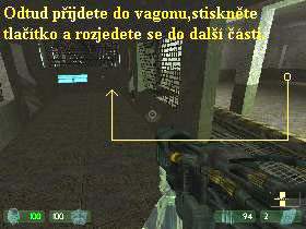 Stiskněte tedy tlačítko vpravo u dveří, dejte se za nimi doprava, pod schody vlevo vůbec nic není, v místnosti napravo také ne, jděte proto dopředu a na konci si seskočte dolů a pravým dopravníkem pokračujte dál. Zabočí s vámi doprava a vy si na konci přeskočte hodně doleva a dopředu, jinak skončíte vpravo dole v ohni. Zastřelte svého prvního robota, v místnosti vpravo stiskněte tlačítko na panelu, vraťte se a pokračujte vpřed zeleným tunelem. V místnosti zlikvidujte další dva roboty, po zemi posbírejte náboje a vlevo vyjděte nahoru po schodech, kde rozstřelte opět robota a jděte dál novou zelenou chodbou doleva. Vlevo je další robot, v místnosti vlevo od něj jsou náboje. Na konci tunelu vstupte do dveří vpravo před vámi, v chodbě zlikvidujte dalšího robota, pokračujte chodbou a projděte dveřmi. Vlevo za dveřmi číhá další robot, pokračujte dopředu a vstupte po schodech vlevo před vámi do haly. Vlevo přejděte přes plošinu, zabočte doprava, jste ve vagónu, na konci zmáčkněte tlačítko a vagón se s vámi rozjede a zastaví až v další části.