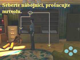 naleznete zavražděného Hackera. Z podlahy seberte nábojnici,