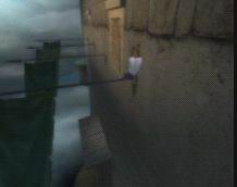 Napravo od vás bude nad schodištěm písek, který neváhejte sebrat (11), a pak se vydejte ke žlutým dveřím nalevo. Římsa sice spadne, ale tím vám dopomůže dostat se na zelenou stříšku. Přeběhnutím po stěně se dostanete na druhou stříšku, ze které se dostaňte na první tyč uchycující vlajku. Po tyčích přeskákejte dozadu na zelenou stříšku (viz obrázek) a z ní přeběhněte na dřevěný rám okna pod tyčemi.
