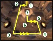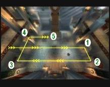 Napijte se vody a vyběhněte po schodišti k dalšímu písečnému oblaku (42). Nyní se držte obrázku: Sešlápněte dlaždici u fontánky a utíkejte k vysunutému sloupku (na mapce je označen číslem 1).