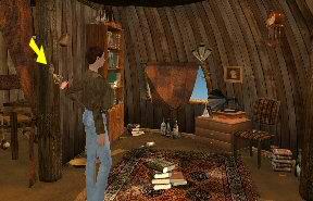 Doprava a podívejte na papír, který je na stole poblíž krbu. Rozhodně nepřehlídněte zabetonovaný vchod, klikněte na cihlu, která je vlevo, čímž se odsune stěna a projděte jí do další místnosti. Na stole leží knot od dynamitu (fuse) a podívejte se na papír s periskopem. Doleva a pokecejte s Peterem, pak klikněte na periskop, čímž ho otočíte o 90°. Vrate se zpět a spojte knot s dynamitem a pak to hoďte do koše, který tu visí. Připravte si zapalovač a zapalte. Dojde k výbuchu, ze kterého zbude železná tyč, kterou v inventáři spojte s lanem. Spojený výtvor dejte do díry ve stropě.