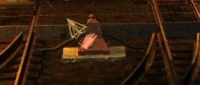 Dejte se doprava, tam uvidíte dynamit připevněny na stěně. Použijte žebřík a vylezte na něj nahoru. Nožem odřízněte dynamit, pak slezte do dolů a doleva k vozíku s dynamitem. Pokecejte nejdříve s kapitánem, pak běžte na konec kolejí a použijte tam kovový plát na ně a získáte tak malou rampu. Zpět k vozíku a nasaďte si rukavice a pákou (velmi těžko se hledá) přehoďte výhybku.