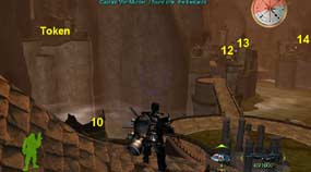 Token: Pred vami, od miesta, kde začínate, sú na skalách baráky, poniže kanón. Odtiažto sa dajte doprava. Za vežou uvidíte skalný previs. Po pravej strane naň vedie cesta. Hore sú dva kanóny a Token.