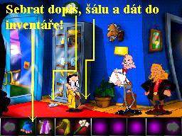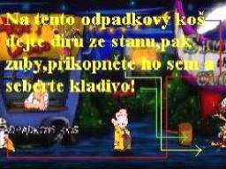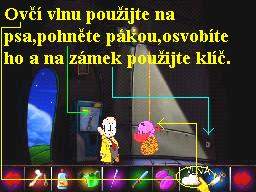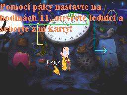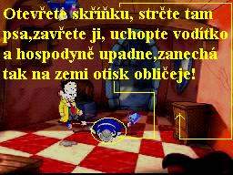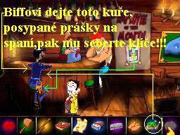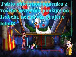 Jděte tedy k automatu na fotografie, drobné mince vhoďte do zdířky a nechejte se vyfotografovat, vlevo ze schránky seberte vaši vyhotovenou fotografii. Vraťte se na Pirátskou loď, vaší fotkou z inventáře přelepte tu na plakátě a promluvte si znovu s moderátorem. Teď ve vás pozná Zaměstnance měsíce, předá vám odměnu a to dárkovou tašku, kterou v inventáři ihned prozkoumejte, získáte tak mosazný štítek, tedy pamětní plaketu. Přeneste se na Hlavní náměstí, kde vstupte do Pizza Baaru, mosazný štítek vložte do pece, jakmile se roztaví, seberte ho holýma rukama (!!!), a rychle ho v inventáři vložte do sádrové formy. V inventáři tuto formu použijte, získáte tak píšťalku ve tvaru kosti. Nyní se vydejte ke strážci mostu a jeho Kikince, vezměte to přes Pirátskou loď a doprava kolem Intelektuála, u stromu s dírou v kmeni zapískejte na píšťalku, Kikinka zavětří a dotáhne hlídače k díře, ale dostane od něj vynadáno a oba se vrátí na svůj původní post. Takže ejhle, píšťalka funguje přímo vzorně, vraťte se znovu přes Velkou hlavu do místnosti kouzelníka Lorenze, prozkoumejte klobouk, zjistíte, že je v něm králík. Opět, pokud jste dbali mých rad, máte v inventáři mrkev (byla též u Vousaté báby), použijte mrkev na klobouk a hladový modrý králíček se do ní s chutí zakousne a tak si ho strčíte za košili. Vraťte se znovu k mostu, do dutiny ve stromě vložte králíka a zapískejte opět na píšťalku. Kikinka dotáhne hlídače zase k dutině, ve které je králík, strážný ovšem zjistí, že příčinou jejího vzrušení je vaše osoba, dostanete vybadáno a varování, že příště už vám vaše legrácky neprojdou. Takže se vydejte zpět k Mortierovu Bazaru, vstupte dovnitř a ze skoby vlevo vedle hlavy nosorožce seberte lano, tedy vlastně oprátku, poté se vraťte zpět k dutině stromu, do které jste vložili před chvílí králíka. Konec oprátky přivažte pod dutinou k trsu trávy, obejděte strom zprava k Ruskému kolu a druhý konec oprátky přivažte ke spodní kabince Ruského kola. Teď si zase raději hru uložte, musíte být nejen velice rychlí a dostatečně obratní, ale pokud vám tato akce na chlup nevyjde, museli byste začínat znovu od posledního uložení, neúspěch totiž napravit nelze. Vraťte se k dutině stromu, znovu zapískejte na píšťalku, jakmile Kikinka dotáhne hlídače ke stromu, utíkejte k Ruskému kolu, tam pokračujte vlevo, honem otevřete dveře od modré kabinky, zatáhněte za páku a výsledek je šokující. Ruské kolo se roztočí, přitáhne si hlídače a ten snad stráví zbytek života v kotrmelcích, je to zkrátka pohled pro bohy (:-o !!!). Teď se můžete vydat k mostu, Kikinka je zaujata tak králíkem v dutině stromu, že neslyší ani zoufalé volání svého pána o pomoc, přejděte v poklidu přes most a ocitnete se uvnitř Hradu.