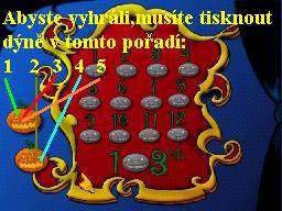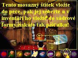 Jednu takovou užitečnou a velice potřebnou nádobu najdete na fontáně, ke které se dostanete vpravo od hlavního náměstí. Vraťte se tedy k dřevěnému záchodku, pod rozcestníkem leží na zemi klacek, který seberte. Pokračujte k fontáně a pokuste se kotel shodit, ale nedosáhnete na něj. Vydejte se tedy k Intelektuálovi, který provozuje hru „Třináct dýní“, je to něco podobného, jako dobře známá hra „Zápalky“. Naleznete ho vlevo od Rakety, nejdříve si nechejte vysvětlit samotný princip hry a potom se můžete pustit do hry. Naskočí vám hrací plocha a vlevo jsou pod sebou dvě dýně s čísly 1 a 2. Abyste vyhráli, musíte na ně kliknout v tomto pořadí: dýně 1, poté 2, potom znovu1, dále 2 a nakonec 1, jestliže jste dodrželi popsané pořadí, vyhráli jste a jako odměnu obdržíte plyšového fialového tapíra, kterého si vezměte. Přes mapu se vydejte na malé náměstí, do malé fontánky vložte vyhraného tapíra a tak ji ucpete, tím se zvýší tlak vody ve velké fontáně. Vraťte se tudíž k ní, znovu na kotel použijte klacek, teď už ho srazíte, takže ho seberte ze země. Potřebný základ už tedy máte, takže se můžete pustit do hledání ingrediencí. Vezměte to tedy přesně v tomto pořadí: káva, mléko, kamarův žlučník, ovocný džus, tu největší třešni a pepř.