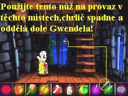 Konečně jste se tedy ocitli na hradním nádvoří, no ještě zdaleka však nemáte vyhráno. Nejdříve ze všeho prozkoumejte uzamknutý vchod do podivného zeleného monstra, čert ví, co to vůbec je, totéž udělejte i se strojem vlevo od vchodu. Jděte dopředu, ocitnete se tak před hradní bránou, kterou projděte dovnitř, nalézáte se v místnosti, kde si pohovořte s Hospodyní, které se zeptejte na majitele hradu, dozvíte se od ní, že je zamčený v té obrovské zelené dýni (aha, tak ona je to dýně :-o), pokračujte v rozpravě, musíte se pokusit zjistit, jak se lze do tohoto dýňového monstra dostat. Hospodyně vám prozradí, že ten stroj před vchodem do dýně je počítač (!!!), pokud se nad ním ona skloní, počítač si ověří vzhled jejího obličeje a automaticky pak dveře odemkne. Aby vám tímto popsaným způsobem pustila do dýně, k tomu ji zaboha nepřemluvíte, tak to raději vzdejte. Vyjděte znovu před hrad, odbočte doleva, ocitnete se před dvěma sochami. Promluvte si s nimi, kupodivu zjistíte, že jsou to herci, zeptejte se jich, kdy jim končí šichta, odpoví vám, že o půl čtvrté. Čekají už ale velice netrpělivě, protože hodiny na věži stále ukazují tři hodiny, zřejmě se na tomto čase zastavily a oni tam tudíž tvrdnou, jako blbci. Zeptejte se jich nyní, zda by vám nepůjčili jejich nůž, budou souhlasit s tím, že ale až budou mít padla, teď nůž patří k jejich převleku. Projděte tedy znovu dovnitř hradu a z místnosti s hospodyní stoupejte stále chodbami až nahoru, tak se ocitnete na vrcholku věže, kde vidíte v rozích tři kamenné chrliče. Pokuste se shodit dolů ten vpravo vpředu, zjistíte ale, že na to nemáte dostatek sil, nu což, vraťte se tedy dolů zpět k hospodyni a pokuste se sebrat z jejího vozíčku s čistícími potřebami JAR, s čímž ovšem ona nebude souhlasit, neboť vaším kecům vůbec nevěří. Nyní ji tudíž musíte přesvědčit, aby podstoupila test, kterým zjistíte, zda dokáže vidět i zátylkem vlastní hlavy. Otočí se čelem ke zdi, toho využijte a šlohněte ji rychle JAR. Projděte doleva do místnosti, kde šašek Gwendel tropí hokuspokus s potápěním se do vaničky s vodou, trdlo jedno. Promluvte si s ním, bude popudlivý, jako vzteklý pes, nedbejte ale na to a jakmile si znovu ponoří hlavu pod vodu ve vaničce, šupněte mu tam JAR, ztratí se z místnosti a nezbude po něm ani ta příslovečná žižlavá čára. Teď tedy odstrčte vaničku do boku, objevíte tak poklop, otevřete ho a sejděte dolů do Dračí sloje, vpravo na konci červeného draka jsou malá šedá dvířka, prozkoumejte je a ihned otevřete, poté prozkoumejte i takto vzniklý otvor, zjistíte, že tudy vede cesta do drakovy nádrže. Nyní se vraťte zpět k hospodyni, vyjděte před hrad, dejte se doprava kolem na zemi sedícího Gwendela a zkuste mu sebrat psa, neuspějete. Pokračujte dále vpravo, seberte konev a kanystr, pokračujte dál, dokud se nedostanete k dřevěné chatrči, do které, jak také jinak, vejděte dveřmi. Zjistíte, že jste v chlévě, vzadu vlevo za přivázanou ovcí seberte ze země zelenou hadičku. Zpáteční cestu do Dračí sloje přece znáte, vraťte se tam proto, po cestě seberte svíčku z dortu a do otvoru za otevřenými šedými dvířky hadičku zasuňte, pak na ni použijte kanystr, který tak naplníte palivem. Vpravo si promluvte ze studní, ale dole se nacházející stařec chce za každou vaši otázku, na niž by odpověděl, dolar, snad ani nemusím zdůrazňovat, že jste trvale švorcoví, tak na něj „hoďte bodlo“, dostane za chvíli to, co si vykoledoval. Vhoďte do studny kanystr s palivem, ze studny vyšlehnou plameny, připalte si od nich svíčku, ještě spatříte pěkně očouzeného dědka a vydejte se znovu před hrad, jděte ke chlévu a kousek za ním je kupka sena. Zapalte jí pomocí hořící svíčky, jakmile seno shoří, seberte ze země vlevo přede dveřmi jehlu (pozor, je velice snadné ji přehlédnout), teprve poté vstupte do dveří. Uvnitř leží na zemi činky, opakovaně si s nimi zacvičte, získáte v pažích sílu, jako samotný Rambo. Vraťte se znovu známou cestou až na samý vrchol věže hradu, kde se pokuste znovu shodit dolů pravý přední chrlič, což se vám po chvíli za přispění tajemného ducha podaří. Padající chrlič se ale zachytne za provaz na hodinách a tak posune jejích ručičky na šestou hodinu. Oba herci usoudí, že už je tedy po šichtě, odklušou do neznáma, ale na podstavci vám zanechají slíbený nůž. Vraťte se tam tedy pro něj, potom jděte znovu zpět do věže, kde lze spatřit z okna provaz, zadržující doposud kamenný chrlič. Na provaz použijte nůž (může se stát, že vám nepůjde provaz hned přeříznout, musíte najít na něm přesně aktivní místo), přeříznete tak provaz a chrlič spadne dolů zrovna na „kedlubnu“ Gwendela, po kterém nezůstane ani ten mastný flek. Sejděte tedy dolů k němu a teď už si jeho pejska můžete vzít, zjistíte ale, že je to jen vycpaná atrapa.