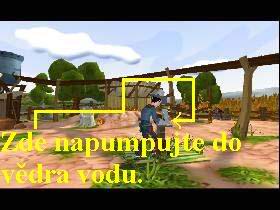 Po shlédnutí animace, v níž tlupa banditů vedená Starkem dojede k farmě statkáře Bennistera, aby od něj třeba i násilím „odkoupila“ jeho pozemky a v níž zatnete choutkám banditů tipec, budete pozvání do farmářovy rodiny na večeři, udělá se vám zle z artyčoků a procitnete se až ráno v posteli. V reálu si nejdříve prohlédněte stolek, seberte z něj pistole, ihned ale zjistíte, že to nejsou vaše kolty, ale hračky farmářova synka Billa, který vám je zřejmě vyměnil. Z buvolích rohů seberte provaz, z věšáku na zdi pouzdra na pistole a vydejte se do kuchyně. Promluvte si s farmářovou ženou Stellou, sama vám nabídne, abyste ji takto oslovovali, využijte všechny nabízené varianty rozhovoru, poté jděte ke stolku, na kterém stojí soudek s pípou, z šuplíku seberte své prví čtyři dolary. Můžete sebrat ještě měchy a jablko, z věšáku vedle dveří si vezměte váš klobouk a vyjděte dveřmi ven na volné prostranství. Jděte k ohradě, ve které odpočívá váš koník, projděte dveřmi ohrady, aktivujte koně a zjistíte, že váš kůň nemá jezdecké sedlo. Vydejte se tedy doprava do seníku, sundejte sedlo a vezměte si i pilku a provaz, vraťte se k vašemu koni Bleskovi a osedlejte si ho. Pokuste se nasednout, ale uvidíte, že je hladový (pět políček nasycenosti je prázdných), z čehož vyplývá, že kůň se z místa ani nehne. Můžete mu zkusit dát jablko, ale on je jenom nakousne a hned vyplivne, není to pro něj to pravé ořechové, Blesk má rád pouze mrkev. Nezbývá vám tudíž nic jiného, než se po nějaké poohlédnout. Vraťte se tedy na nádvoří, naproti stavení jsou malé záhonky a na nich roste mrkev. Pokud mrkev prozkoumáte (ukazatel její zralosti), zjistíte že není zralá a nemůžete ji tudíž vytrhnout ze země. Jděte tedy zpět do stavení za Stellou, opět využijte všechny nabízené možnosti dialogu, tak se dozvíte, že mrkev je nutno hodně zalévat. Vyjděte ven ze dveří a vlevo ode dveří je u latríny vědro, které seberte. Vraťte se ke dveřím, naproti nim je pumpa, použijte na ní vědro a pak zapumpujte (obr.1), seberte vědro s vodou a použijte je na záhonek, mrkve povyrostou. Toto opakujte stále dokola, prozkoumávejte mezi zaléváním zralost mrkví a jakmile jsou zralé vytrhněte je ze země. Nespokojte se pouze s pěti mrkvemi, ale udělejte si slušnou rezervu, nabrala jsem si jich takto dvacet. Potom se vraťte k Bleskovi a nakrmte ho, ukazatel hladu se musí zaplnit červeně, pak na něj nasedněte. Tímto způsobem tedy opustíte farmu, hned nato spatříte na obrazovce mapu, která vám nabízí vyjet do různých lokací, vy se ale vydejte po cestě doleva, na další farmu, která patří Alvinovi Jonesovi.