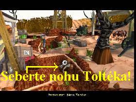 Během návratu na farmu budete přepadeni Starekovými ostrostřelci a průsmyk, přes nějž projíždíte, zavalí tito obrovskými balvany. Dostanete příkaz od Alvina pistolníky zlikvidovat, jsou celkem čtyři, dá vám dynamitovou patronu, ta však má krátký doutnák, takže po minutě vybuchuje. Musíte si tedy prostřílet cestu stále doprava kolem pistolníků (postupujte vpřed pomocí levého tlačítka myši a střílejte o sto šest jejím pravým), první je hned vlevo proti vám, druhý o kousek dál schovaný za sudy, další se kryje na břevny o kousek dál vpravo, poslední je úplně na konci vlevo nad vámi za balvany, pokud se vám je podaří v časovém limitu zlikvidovat, v animaci hodíte dynamitovou patronu na zátaras a cesta je uvolněna, v opačném případě si vše automaticky zopakujete znovu. Po vyhrané přestřelce ve zmíněném průsmyku se ocitnete ve městě, nasedněte na drezínu a odjeďte k mostu. Dejte se doleva pod zničený most (na místo činu), kde si promluvte se šerifem, vyčerpejte všechny možnosti, zjistíte, že tam hledá důkazní stopy. V inventáři, jak jsem vám radila hned téměř na začátku, byste měli mít Bleskem nakousnuté jablko, toto položte na břeh, šerif podle otisků velikých zubů na ohryzku usoudí, že výbuch způsobil nějaký vysoký a mohutný muž (i položení nálože vysoko pod most prý tomu nasvědčuje), tedy jakýsi Super farmář. Nasedněte na drezínu a vraťte se do města, obejděte šerifovu kancelář zezadu a zjistíte, že šerif hledá u probourané zdi do vězení nějaké další stopy po mohutném Super farmáři. Takže mu budete muset podstrčit druhý falešný důkaz, nasedněte na koně, jeďte na farmu Alvina Jonese, promluvte si s Joem, ale je důležité sebrat z výkopu před vámi kamennou nohu Toltéka (obr.8). Vraťte se zpět do města, jděte k díře do vězení a nohu z inventáře použijte na bláto, šerif zachrochtá spokojeností, když stopu objeví a hned se rozjede na Starekovu farmu, aby ho přesvědčil o nebezpečí, číhající na něho ze strany neexistujícího Super farmáře. Jakmile zmizí z dohledu, nasedněte na koně a na farmu Stareka se vydejte i vy. Tam sesednete z koně, vlezte do odkrytého otvoru a tak se přes tajnou chodbu dostanete do knihovny, odtud projděte dveřmi na chodbu, pokračujte po schodech nahoru do Rhiannonina pokoje, vylezte ven oknem, spusťte se dolů a vydejte se doprava směrem ke kuchyni. Tak se spustí delší, velice zajímavá a výmluvná animace, spatříte rozhovor šerifa se Starekem a samozřejmě že i setkání vás s Rhiannon, vymyslíte plán přímo ďábelský a společně s Rhiannon odjedete na farmu Alvina Jonese.
