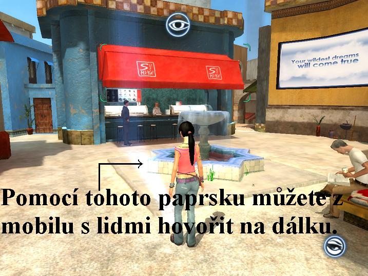 Ocitli jste se tudíž na ulici, odbočte doleva a vydejte se vpřed. Prohlédněte si po cestě poštovní schránky, seběhněte dolů po schodech a naproti si promluvte s vaší kamarádkou obchodnicí Olivií. Na její dotaz, zda máte chvilku čas, odpovězte že ano, pak za ní vstupte do jejího obchodu. Prohlédněte si po obou stranách všechny dostupné předměty, popojděte vpřed, tak v animaci spatříte na televizní obrazovce známé černé děvčátko, opět volající „najdi mě-zachraň mě“. Nato si pokecejte s Olivií o všem možném, poví vám mimo jiné o jejím novém hardware, který dokáže váš mobil chránit tak, že váš rozhovor nezachytí satelit a vysvětlí vám princip jeho funkce. Víc už se ale nedozvíte, neboť Olivii zazvoní její mobil a bude muset vyřídit objednávku zboží. Takže nyní vyjděte ven, odbočte doleva a seběhněte dolů po schodech na náměstí s kašnou. Tak se v animaci setkáte s další kamarádkou, která má rovněž namířeno do tělocvičny. Promluvte si s lidmi na náměstí, vyzkoušejte si, jak se dá pomocí vašeho mobilu0000006545_n01.jpg (86076 bytes) (obr.1) odposlouchávat pomocí zapnutí paprsku, či hovořit s lidmi na dálku (pravé tlačítko myši paprsek aktivuje a zpětně deaktivuje), potom si promluvte s další vaší kamarádkou Karen, která prodává v bufetu MOCA LOCO, proberte s ní všechny možnosti rozhovoru. Pokračujte vpřed uličkou vpravo před vámi, projděte kolem bistra SUSHI YA, vydejte se ulicí doprava, pokračujte kolem dvou děcek a dvou šachistů ke dveřím tělocvičny a projděte jimi.
