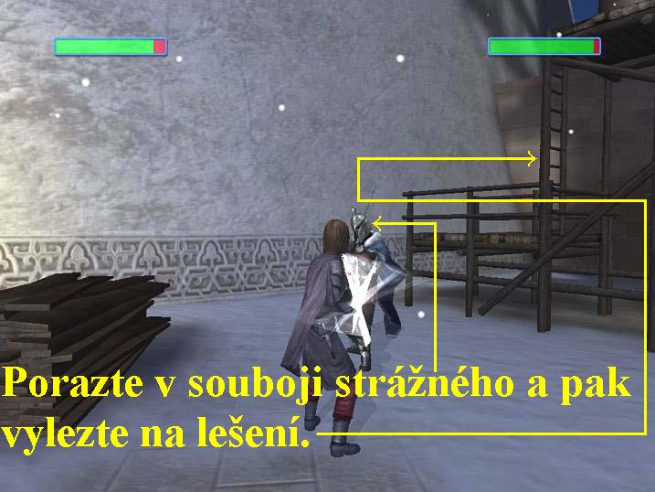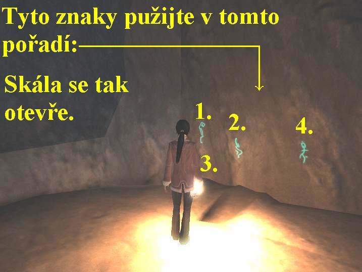 Probudíte se ve světě, který jste už tolikrát viděli ve vašich vizích. Kolem je mráz a sníh, vy však zimu necítíte, vlastně necítíte vůbec nic. Vydejte se k černému domečku, tak opět spatříte známou dívku, která vás bude jako vždy vyzývat, abyste zachránili April. Po chvíli provede jaké si kouzlo, led kolem vás se počne rozpadat a vy se zřítíte dolů. Poté co se proberete z bezvědomí, zjistíte že se nacházíte v podzemní jeskyni, kde teče řeka. Musíte se vydat dopředu, ale nejdříve seberte před vámi dva oblázky, kousek od vás vpředu střeží cestu dál dva Trollové. Pokud nechcete s nimi bojovat, jděte tiše vpřed a jeden oblázek vhoďte do řeky, což Trolla zaujme a můžete kolem něj tiše projít dál. Poté si vylezte na plošinu a vhoďte druhý oblázek do vody co nejblíže k druhému Trollovi, bude zkoumat co se děje a tak projdete tiše i kolem něj. Já zvolila přímý boj, pustila jsem se do soubojů s oběma Trolly a vězte, že přemoci je úplná hračka, jsou tupí a mnoho inteligence nepobrali. Jakmile se zbavíte druhého Trolla, seberte na tyči napíchnuté zářící vejce. Pokračujte vpřed, vejce vám osvětluje cestu, tak dojdete k obrovskému mlýnskému kolu, pokud si ho prohlédnete, spatříte na něm nahoře malou plošinku. Před kolem vyběhněte po schůdcích vpravo nahoru, tak se dostanete k panelu s kolem. Jestliže si i tento prohlédnete, zjistíte, že na panelu na horní části je malý důlek. Otočte tedy nejdříve kolem a poté posaďte do zmíněného důlku zářící vejce a znovu otočte kolem, dobře poslouchejte, budou se vám ozývat tóny. Spustí se tak proud vody, který klem počne otáčet, seberte zářící vejce a seběhněte po schodech zpět ke kolu. Ve vhodnou chvíli naskočte na jeho plošinku, kolo vás vyveze nahoru, kde včas přeskočte mezeru v plošině a vydejte se k žebříku, po kterém vylezte nahoru. Pokračujte vpřed až na samý konec jeskyně, zde na skále vidíte tři podivné znaky. Pokud na ně zatlačíte, ozývají se různé tóny. Nyní tedy musíte zatlačit na znaky v tom pořadí, abyste zahráli stejnou melodii, kterou jste slyšeli při druhém otočení kolem na panelu. No nebudu vás napínat, stiskněte levý znak, poté prostřední, znovu levý a nakonec pravý0000006545_n04.jpg (49913 bytes) (obr.4), tak se skála rozestoupí, skrčte se a vstupte do vzniklého otvoru, projdete jím na druhou stranu a ocitnete se v jakémsi sklepě. Jděte k protějším dveřím a prohlédněte si je, zjistíte, že jsou poněkud zchátralé. Kopněte tedy do nich dvakrát po sobě a tak je vyrazíte, přejděte do druhého sklepa a po schodišti naproti vyběhněte nahoru, ocitnete se v hospodě. Promluvte si s hostinskou, zjistíte, že je majitelkou této hospody, nazývané U Poutníka a jmenuje se Benrime Salmin. Proberte s ní všechny možnosti rozhovoru, zjistíte tak, že jste na „opačné straně“ a získáte spousty nových zajímavých informací. Nechce vám ale nic dopodrobna vysvětlovat, doporučí vám, abyste raději nalezli Minstrum Magdu, od ní se dozvíte všechny odpovědi na vaše zvídavé otázky. Pomoci vyhledat by vám ji mohl Slepý Bob, který sedává na lavičce před hospodou. Vyjděte tedy před hospodu, seběhněte doleva po schůdcích a vyzpovídejte Slepého Boba, žebráka který ani ve skutečnosti slepý není. Pohovořte si s ním a opět proberte všechny nabídky rozhovoru, hlavně se zeptejte na Minstrum Magdu, přislíbí vám pomoci, ale chce napřed láhev dobrého okořeněného svařeného vína. Vraťte se tudíž do hospody a promluvte si znovu s hostinskou o víně. Víno má, je ochotná vám ho svařit, ale došlo jí koření, které jí dodavatel neposlal. Vysvětlí vám, kudy se na tržnici dostat, musíte jít ale oklikou, neboť brána je uzavřená. Vyjděte tedy znovu před krčmu a vydejte se doleva kolem žebráka ke kostelní věži (vpravo hlídá bránu stráž a dál vás nepustí).