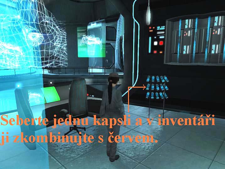 Seběhněte tudíž po schodech dolů až do padesátého osmého patra a počkejte, až Damien vypojí poplašné zařízení, červené světélko na dveřích se musí změnit na zelené, potom dveřmi projděte. Po celou dobu vaší další činnosti se vám budou vybavovat vzpomínky na Damienovy instrukce, je to jakýsi návod, jak postupovat dál. Vstupte do chodby a nyní si budete muset dávat pozor na robo pavouka, jakmile vás zaměří, spálí vás, proto pokud na něj narazíte, ukrývejte se včas do výklenků, kde vyčkejte, až kolem vás přejde, teprve potom pokračujte dál, chodba je uzavřený kruh, takže zabloudit nemůžete. Vydejte se tedy doprava a jakmile přejdete o kousek dál kolem dveří po levé straně, vpravo na zdi otevřete špatně viditelnou schránku, kterou otevřete, stačí když na její vnitřek použijete z inventáře mobil, tak tam vložíte software od Damiena. Pokračujte chodbou dál, nyní musíte najít vchod do laboratoře, poznáte ho podle označení modrého symbolu s atomem. Pokračujte tedy dále doleva, protože pavouk chodí stále dokola jedním směrem, je to cesta delší, ale mnohem bezpečnější. Vstupte dovnitř a ze stojanu vpravo seberte jednu z mnoha modrých kapslí a v inventáři ji spojte s červem, kterého jste dostali od Damiena0000006545_n06.jpg (83507 bytes) (obr.6). Nyní se musíte dostat do mediální laboratoře a naskenovat vaší i červovu DNA. Pokračujte tedy přes dvoje dveře doprava, vstupte do dveří označených zelenou ikonkou v podobě písmene „M“. V laboratoři vlevo je malý skener, použijte na něj z inventáře kapsli s červem a tak ho naskenujete. Vpravo je potom velký skener, do kterého vstupte a budete tak naskenováni i vy. Teď se musíte dostat do bezpečnostní místnosti, jsou to dveře s oranžovou ikonkou, která má uvnitř zkřížené meče. Poté co je otevřete, zjistíte, že místnost je zabezpečena systémem, o kterém vám Damien řekl, že ho nedokáže deaktivovat, takže to bude opět na vás. Jelikož tam vstoupit nemůžete, vydejte se chodbou dál a vejděte do dveří, označených mechanickou rukou. Vlevo vidíte několik mechanických robo pavouků, na jednoho z nich použijte z inventáře mobil a tak ho ovládnete. Nyní se tedy jako ovládaný robo pavouk vydejte do chodby a jakmile se potkáte s tím otravným hlídačem robo pavoukem, klikněte na mezerník a tak ho zlikvidujete a konečně se ho zbavíte. Znovu klikněte na mezerník a tak si zněj stáhnete jeho programová data. Nyní pokračujte s vámi ovládaným pavoukem do bezpečnostní místnosti, po pravé straně je nášlapná plošina, stoupněte si na ni a systém deaktivujte pomocí mezerníku. Vrátíte se automaticky do lidské podoby a vydejte se do bezpečnostní místnosti. Přes židli je přehozeno sako, z kterého seberte bezpečnostní klíč, poté se vraťte zpět na chodbu a najděte poslední dveře, které jste ještě neotevřeli, použijte na ně klíč z inventáře, projděte jimi a ocitnete se v centrálním jádře. Aktivujte panel vpravo a vstupte do dekontaminační komory, kterou jste si takto otevřeli. Poté vstupte do jádra a vydejte se tichým krokem vpřed po kulaté rampě, dávejte pozor, neboť na ní pracují dva vědci, muž a žena, pokud vás spatří, zabijí vás. Propližte se k jednomu ze schodišť a sestoupejte po něm tiše až dolů. Zde vložte do panelu kapsli s červem a už jen sledujte animaci a dlouhý rozhovor obou vědců se svými, s postupem prací nespokojenými nadřízenými.