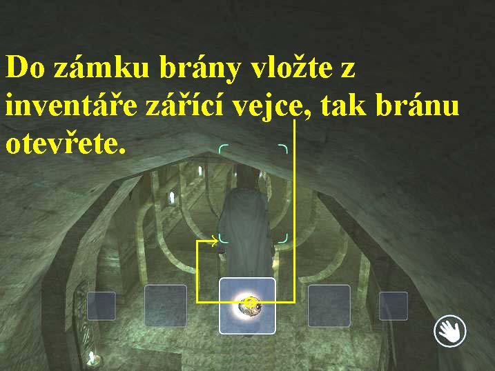 Jako April se spustíte po laně dolů k obrovskému známému mlýnskému kolu. Seběhněte po schodech dolů, zabočte doleva, poběžte dopředu a odbočte doprava na zničený most. V animaci spatříte, jak Prorok odjíždí po řece na loďce, další loďka nikde není, takže se vraťte za bočte doprava a schovejte se vlevo za skálu. Otočte se a dívejte se před vás, vyčkejte, až se objeví před vchodem velice plachá příšerka, potom rychle vyběhněte vpřed, jen dávejte pozor, ať ji nevyplašíte a jakmile vstoupí vpravo do dveří, rychle jimi také vběhněte dovnitř dříve, než se za ní zavřou. Uvnitř se schovejte za oltář, musíte ho obejít a použít ikonku skoku, jakmile se objeví další plachá příšerka a půjde ke dveřím naproti vám, zapněte dálkový pohled pravým tlačítkem myši a hned nato, jakmile bude u dveří, prohlédněte si ji levým tlačítkem myši, tak v animaci zjistíte, v jakém sledu používala tajná tlačítka. Poté, co se dveře za ní zavřou, přistupte k nim a v animaci si je odkoukaným způsobem automaticky otevřete, projděte jimi a seběhněte dolů po schodišti. Pokračujte vpřed chodbou, tak se spustí animace, ze které zjistíte, jak se ukrývat před strážci, kterými jsou Trollové. Při pokračování v další cestě tudíž musíte být velice opatrní a obezřetní, jakmile vás některý z těchto strážců zmerčí, sám sice uteče, ale přivolá obrovského Trolla, který vás na místě zabije. Jakmile tedy už zdálky některého malého Trolla uvidíte, rychle se schovejte za nějaký výstupek, je jich po cestě dostatečné množství a tam vyčkejte, až strážce zmizí, teprve potom pokračujte dál. V této části jeskyně se nacházejí tři sochy, na kterých je nutno správně nastavit symboly tak, aby ten správný byl vždy nahoře. Na soše nacházející se na schodišti, po kterém jste sem seběhli je první socha, na ní nastavte do horní části symbol, připomínající písmeno „X“. Pokud půjdete dál, spustí se animace, ve které spatříte malého Trolla jít doprava, po jejím skončení se tudíž vydejte doleva, tak narazíte na druhou sochu, kde nastavte symboly tím způsobem, aby v horní části kruhu byl symbol, připomínající dopisní obálku. Vraťte se zpět, ukryjte se a vyčkejte, až se Troll bude vracet, jakmile kolem vás projde, jděte do chodby, ze které vyšel. Na konci se nachází třetí socha, zde nastavte kruh tak, aby nahoře byl symbol, který vám připomene herní kurzory pro zaměřování zbraní. Poté od sochy pokračujte doprava až na samý konec chodby, tak narazíte na narušenou zeď. Třikrát po sobě do ní udeřte, tak se sesype a vy prolezte o patro níž. Pokračujte doleva a pokračujte rovně nahoru po schodech, po pravé straně si všimněte brány, ke které musíte najít klíč, sem se za chvíli vrátíte. Nahoře nad schody odbočte doleva, tak dojdete na křižovatku, zabočte na ní vlevo, přijdete k poslední, tedy čtvrté soše. Na kruhu nastavte nahoru symbol, připomínající písmeno „V“. V následující animaci spatříte otvírající se bránu, která obsahuje všechny čtyři symboly, které jste správně nastavili na zmíněných sochách (správně byste měli nejdříve dojít až k této bráně a zjistit si symboly, které ji otvírají a teprve potom nastavovat symboly na sochách, před místností se sarkofágem je ve stěně tunýlek, přes který se dostanete k tajným dveřím, přes které je možno se vrátit zpět do prvního patra). Vraťte se na křižovatku a pokračujte dál nahoru po schodišti vpravo. Nahoře zabočte doprava a projděte přes bránu, kterou jste si před chvílí zpřístupnili až ke kamennému sarkofágu. Ten otevřete a vyberte z něho zářící vejce a vraťte se až na místo, odkud jste sem vlezli. Zde je mnou vzpomínaná brána, na kterou jsem vás před chvílí upozornila. Do důlku v jejím zámku vložte zářící vejce z inventáře0000006545_n07.jpg (63297 bytes) (obr.7), tak bránu otevřete a pokračujte přímo dál chodbou, nikam neodbočujte. Na konci vyběhněte nahoru po schodech, ty se před vámi samy otevřou, projděte jimi na balkón. Spustí se animace a v ní uvidíte, jak Prorok nabádá dva Trolly k ostražitosti, jsou to už bestie, nad kterými nemáte tu nejmenší naději v boji zvítězit. Po skončení animace seběhněte dolů po schodišti doprava, jakmile vás Troll spatří, poběží k vám. Rychle se vracejte zpět na balkón, přeběhněte k levému schodišti, seběhněte dolů, odbočte vpravo, utíkejte dopředu a zabočte na druhé schodiště vlevo, na to prvním hlídá druhý Troll. Toto schodiště se pod vámi propadne, vy se ale zachytíte a vytáhnete se nahoru, tak za vámi první Troll nemůže. Vystoupejte po schodišti doleva, po kamenných stupních se spouštějte dolů, tak se ocitnete za zády druhého, nic netušícího Trolla. Tiše se vydejte (levý Ctrl) na druhou stran, dojdete ke kamenné truhlici, odbočte vlevo a vstupte do mlhy.