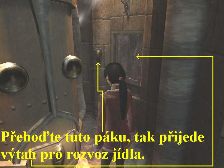 Jako April vyběhněte nahoru k věži a vpravo si všimněte mezery v zídce. Vejděte do ní a sejděte dolů. Po chvíli přiletí vrána a dá se s vámi do řeči. Pošlete ji, ať vletí oknem do věže a vyřídí Zoë vzkaz, že se má dobře rozhlédnou po cele a zjistit, co by se zde dalo udělat. Vrána tudíž do okna a vzkaz Zoë vyřídí, ta však váhá, co udělat. Napadne ji však, že by mohla zaklepat na okénko dveří a tak přivolat bachaře, což také učiní. Jakmile bachař nahlédne do okénka, požádejte ho jako Zoë, ať vám nechá okénko otevřené, neboť trpíte klaustrofobií. Bachař 0000006545_n08.jpg (69473 bytes) odmítne a tak zaklepejte na okénku znovu a svoji prosbu zopakujte, vyhoví vám, ale bude chtít, abyste mu zazpívala písničku, slíbíte mu, že tak učiníte později, takže vám ponechá okénko otevřené. Sdělte tedy vráně, co se vám podařilo a tato to odletí vyřídit April. Nyní si jako April pohovořte s vránou, poví vám, že by bylo dobré použít kouzla, ale ty bohužel ve věži nemají účinek, ale mohli byste vyzkoušet nějaké nápoje, to je chemie a nikoliv kouzlo. Vydejte se tedy jako April do města, projděte tržnicí, vstupte do protějších dveří a pokračujte uličkou vpřed, promluvte si s Roperem Clacksem, to je ten, co jste od něj dostali jeho vzácnou knihu. Požádejte ho o nějaké nápoje, dostanete od něj dýmovnici a láhev kyseliny. Známou cestou se vraťte nazpět k vráně a předejte ji z inventáře kyselinu a dýmovnici (obr.8), ta s ní odletí do věže k Zoë, kde ji oboje předá, tak se oboje objeví v inventáři Zoë. Nyní jako Zoë nalijte z inventáře kyselinu do otevřeného okénka na dveřích cely, tak kyselina steče na zámek a rozleptá ho, nyní již dveře otevřete. Vyjděte ven a odbočte doleva k žalářníkovi, tichým krokem k němu dojděte, zaměřte ho paprskem (pravé tlačítko myši) a z inventáře na něj použijte dýmovnici, padne jako podťatý. Poté co sebou švihne o zem, seberte mu klíče a otevřete jimi branku u schodů. Opatrně a tiše sejděte dolů po schodech, zdálky pozorujte druhého žalářníka, který se domlouvá o jídlo, které mu doposud neposlali. Vraťte se tudíž zpět do vaší cely a sdělte to vráně, ta to odletí povědět April. Tu ihned napadne, že donáška jídla by mohla být dobrou záminkou, jak s dostat do věže. Vydejte se tedy vám již dobře známou cestou do hospody U Poutníka a požádejte hospodskou o sendvič, poté jděte ke starému známému Roperovi Clacksovi a požádejte ho o uspávací lektvar. Ten v inventáři spojte se sendvičem, pak se vraťte zpět k věži. Na pravé straně dveří od jejího vchodu je jakýsi zastaralý telefon, nebo hlásná trouba, promluvte do ní a na dotaz odpovězte, že nesete jídlo pro žalářníka. Poté co vám otevřou dveře, vstupte dovnitř, sedícímu písaři sdělte, že jídlo doručíte sami, je líný a rád svolí, aby se nemusel obtěžovat sám. Jakmile vám stráž otevře dveře, vydejte se do centrální části věže a vstupte do místnosti s velikým boilerem. Otevřete si branku, přistupte k boileru, vpravo od něj je jídelní výtah (obr.9), zatáhněte za páku, tak otevřete dvířka, dovnitř vložte z inventáře sendvič, smíchaný s uspávacím lektvarem, pak pákou výtah zavřete, sendvič tak odešlete výtahem nahoru a bachař se do něj pustí, samozřejmě, že usne. Jako Zoë tedy seběhněte dolů, klíči z inventáře si otevřete dvoje dveře seběhněte po schodišti až dolů, zde se setkáte s April. Vpravo od hlavního vchodu jsou špatně viditelné dveře do kuchyně, projděte jimi, z kuchyně druhými dveřmi se dostanete do skladu. Společnými silami dotlačte velikou bednu pod okno, vylezte si na ní a okno si prohlédněte, zjistíte, že je na něm hák. Slezte tedy dolů a vpravo ode dveří z malé krabice seberte lano, vraťte se k velké bedně, vylezte na ní a na okno použijte z inventáře lano, společně po něm obě sklouznete dolů. April odešla k vráně, tak se tam vydejte za ní, dojde mezi vámi k velice ostré výměně názorů. April Zoë odmítá dále pomáhat, má prý svých starostí dost, odvolává se na rady Strážce Rovnováhy a není s ní kloudná řeč, takže se sami jako Zoë vydáte hledat pomoc. Vrána však stojí při vás a vyčítá April její lhostejnost a neochotu Zoë pomoci a odlétá k Zoë sama, aby jí dělala rádce a parťáka. Potká se s Zoë, vy teď vyčerpejte všechny možnosti rozhovoru s ní, dozvíte se, že máte vyhledat Briana Westhouse, od kterého byste mohli získat velice cenné rady a hlavně i jeho pomoc, poté vám sdělí, že odlétá k Jižní bráně, kde viděla stát Briana. Vydejte se tudíž přímou a nejkratší cestou kolem stánku Ropera Clackse k Jižní bráně, kde se stkáte s Brianem Westhousem, vrána už tam dolétla před vámi. Proberte s Brianem všechny možnosti rozhovoru, tak vám nabídne pomoc a spolupráci, má dispozici vzducholoď, ve které je ochoten vás zavést na Ostrov Temných lidí, kde tito sídlí, což už ovšem dobře víte, Bílá Dračice, jen ta je vám schopna dobře poradit. Po krátké animaci poté ve vzducholodi odlétáte na ostrov Tajemných lidí.