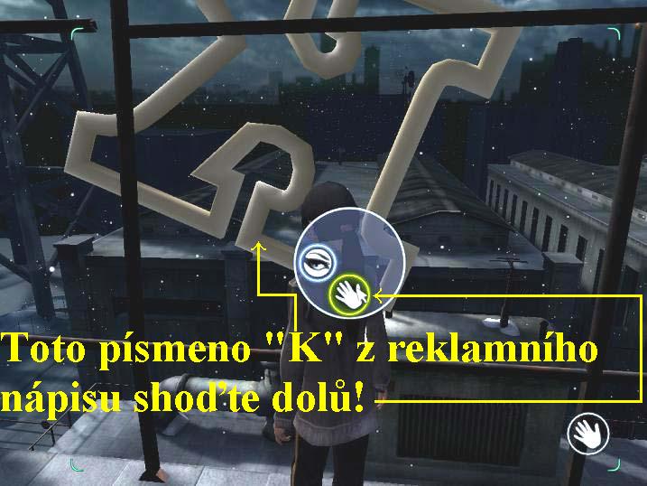 Po vystoupení z taxíku se ocitnete před starým skladem, kde by se podle Damienových souřadnic získaných vámi z jeho počítače mělo nacházet centrum poruch. Před vámi je brána, ale ta je uzamknutá, zkuste aktivovat její panel na sloupu vpravo, ale nejde ani hacknout. Vydejte se tudíž doprava kolem plotu, odbočte doleva, dojdete k osobnímu autu. Na ovládací panel auta z boku vpravo použijte paklíč z inventáře, tak se spustí známý dešifrovací postup, který znáte, když jste chtěli odstranit závoru u Rezova apartmá, opět vás odkazuji na obrázek číslo 2. Problém je v tom, že dešifrování je stále složitější, časový limit je sice stále stejný, ale přibylo znaků, které musíte pospojovat. Jakmile se vám to podaří, použijte na auto mobil, teď musíte auto nastartovat a to stejným způsobem za vyluštění rébusu, což už jste dělali v kapitole III. pomocí software od Číňana, pokud nevíte jak, podívejte se na obrázek 3. Zde již nejste časově omezeni, takže nemusíte spěchat, jakmile rébus vyřešíte, auto nastartujete a to se rozjede a narazí do bedny. Jděte tedy tam, vylezte na bednu a z ní na střechu doleva, odtud vyskočte doleva do mezery v zábradlí, zachytněte se a vytáhněte se nahoru. Z terasy vylezte nahoru po požárním žebříku, odbočte vlevo a zabočte doprava. Dejte si pozor na strážního robota, nesmí vás zachytit laserovými paprsky, neboť by vás zlikvidoval, Jakmile tedy odejde doleva, doběhněte na konec a vpravo po dalším požárním žebříku vylezte výš, odbočte doprava a jděte ke světelné reklamě, shoďte dolů její písmeno „K“0000006545_n10.jpg (78429 bytes) (obr.10), to po pádu prorazí skleněnou střechu dole pod vámi. Nyní slezte po stejném žebříku zpět dolů, vyčkejte až strážní robot poodejde, utíkejte k díře ve skleněné střeše a vsoukejte se dovnitř. Po lávkách si křížem krážem přeběhněte doprava až na druhou stranu, kde seběhněte dolů po schodišti a vpravo slezte po řebříku až dolů do výrobní haly. Obcházejte výrobní linku zleva, na jejím konci odbočte dvakrát doprava, popojděte vpřed a za rožkem vlevo je spínač od generátoru, aktivujte ho, tak zapnete elektrický proud. Pokračujte kolem linky vpřed, kde zjistíte, že toto je určitě místo, odkud vycházel signál, usoudíte tudíž, že to bude někde dole pod vámi. Nyní jděte až na konec, kde si všimněte mřížky dole v podlaze, proudí z ní vzduch, je to zřejmě ventilátor. Vraťte se zpět na druhou stranu, asi v polovině odbočte doprava na schůdky a vejděte do prosklené ovládací kabiny, kde naleznete dva panely. Nejdříve aktivujte pravý panel, kterým ovládáte pohyb ramene stropního jeřábu. Pomocí všech kurzorových klávesnic ho nasměrujte přesně nad mřížku v podlaze. Poté přejděte k levému panelu, též ho aktivujte a kurzorovou klávesou „dolů“ spustíte hák až těsně k mříži.Vyběhněte ven a utíkejte k mříži, kde hák sami ručně do mříže zaklesněte. Vraťte se zpět do ovládací kabiny, aktivujte znovu levý panel a použijte kurzorovou klávesu „nahoru“, tak mříž z podlahy vytrhnete. Vraťte se zpět na místo, kde jste vytrhli mříž, kde vstupte do takto otevřeného otvoru. Ocitnete se v místnosti, zde otevřete zásuvku od stolu a seberte z ní malý klíček. O kousek dál jsou tři skříňky, pomocí klíčku otevřete tu vlevo a vyjměte z ní přístupovou kartu, s ní si otevřete dveře za sklem, ale ještě neodcházejte. Za vašimi zády jsou další dveře, otevřete je přístupovou kartou a vstupte do malého pokojíčku, zjistíte, že zde určitě někoho zadržovali. Na okolních stěnách jsou dětské kresbičky, také je zde vám určitě povědomý hračkářský domeček, z něj vyberte data kostku. Vraťte se do místnosti, kde jste ve skříni našli přístupovou kartu, do počítače na stole data kostku vložte. Nyní tedy spatříte audio záznam doktorky Jeanie Parkové, která zde na příkaz z WATIcorp prováděla pokusy na malé holčičce jménem Faith, to je to černé děvčátko z vašich vizí, věčně volající o pomoc. Dozvíte se i to, že Faith pokusy na ní nepřežila a umřela. Jakmile tudíž audio záznam skončí, projděte prosklenými dveřmi, které jste si již před chvílí otevřeli ke schodišti, po kterém vyběhněte nahoru, kde si přístupovou kartou otevřete dveře, projděte zpět do výrobní haly a utíkejte do prosklené ovládací kabinky. Projděte jí až na konec, kartou si otevřete dveře, přejděte k dalším dveřím a otevřete je. Projděte jimi a seběhněte po schůdcích dolů na dvůr, jděte dopředu k bráně, za kterou už čeká na vás taxík. Vlevo na panel použijte přístupovou kartu, tak bránu otevřete, projděte jí a nastupte si do taxíku.
