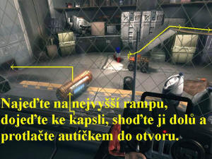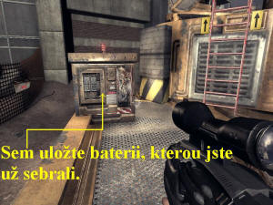 Vstupte do kontejneru před vámi, v běhu rozrazte zadní dveře, utíkejte vpřed, kde se nachází hnědý kontejner s porušenými dveřmi. Pokud do něj nahlédnete z druhé strany, zjistíte, že se v něm nacházejí dva barely, musíte tedy do něj přidat další tři, aby se převážil. Vylezte tedy výš po žebříku, sestřelte dolů barely z vedlejšího kontejneru, ty pak naleznete v hluboké jámě nedaleko od kontejneru. Seberte tedy barel z rampy, na které stojíte (E), slezte po žebři dolů a barel zezadu přihoďte ke dvěma barelům v hnědém kontejneru (levé tlačítko myši). Poté si dojděte do jámy pro dva vámi sestřelené barely a postupně je odneste do hnědého kontejneru, tak se tento převáží. Poté do něj přeskočte, z něj přeskočte na plošinku na zdi a nyní přejděte do další části. Rychle postřílejte poletující bestie, vystoupejte si nahoru k jeřábu, podívejte se doleva a zjistíte, že tam chybí jeřáb pohánějící baterie, takže ji musíte nalézt a usadit ji tam. Vylezte si na kabinku jeřábu, po jeho rameni šplhejte až na konec, odkud si přeskočte na plošinu a poté vstupte do místnůstky, kde seberte pistoli. Vyjděte ven, střelte z pistole do červených barelů v kontejneru, poté tímto kontejnerem proběhněte až na druhou stranu, kde seskočte na červenou dodávku dole pod vámi, z jejíž korby seberte raketomet, v jednom rožku je bedna s municí, doplňte si ji. Nyní vylezte po žebříku na lešení, po prknech vyběhněte nahoru do buňky, zde naleznete baterii pro pohon jeřábu, kterou seberte. Tak se objeví na vás útočící letadlo, které vás sestřelí z lešení dolů. Můžete se však pokusit je sundat z oblohy už teď, máte přece raketomet, takže se dobře kryjte a dejte mu na frak. Pokud vás tedy ale sestřelí, kryjte se dole, ukryjte se do nedostavěné místnosti a sundejte ho odtam. Zde to máte ale o to horší, že pokud vám dojde munice, budete si muset doběhnout pro ni k nejbližší bedně, čímž se vystavujete pro letadlo jako snadný cíl. Jakmile se vám tedy podaří letadlo tak, nebo jinak sestřelit, vydejte se nazpět k jeřábu, usaďte baterii (obr.2) na již dobře vám známé místo, poté si vlezte do kabinky a zasedněte za ovládací pult. Pomocí pák rozkývejte bořící kouli (W, A, S a D) visící na rameni jeřábu a to tak, abyste rozbourali zeď rozestavěného domu vlevo a přitom zlikvidovali i všechny zde se nacházející mutanty. Jakmile dílo zkázy dokončíte, koule se utrhne a spadne na zem, natočte tedy ještě rameno jeřábu tak, aby směřovala k vybourané zdi, poté opusťte řídící pult (E), vystupte si z kabinky, vstupte na rameno jeřábu a vyjděte po něm až na jeho vrchol, kde si z něj přeskočte do vybourané místnosti, jděte vpřed, vykopněte dveře (E) a pokračujte dál po prknech.