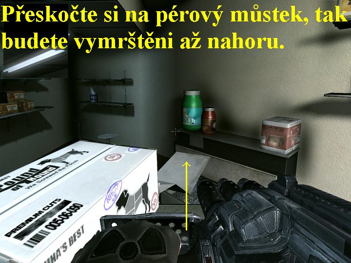Projděte se po madlech, tak si otevřete výtahové dveře, vystupte si z výtahu, jděte doprava a zabočte doprava k velké bedně, kterou rozstřelte. Vstupte dovnitř, odbočte doleva, jděte vpřed a naskočte na zvětšovač, jste opět velicí. Vraťte se a vykopněte troje dveře po sobě, v místnosti pak přehoďte páku na zdi. Vracejte se zpět, jděte k roletě, ze zdi seberte ovladač a roletu nadzvedněte (E a klikejte na mezerník). Projděte ven, vlevo vylezte nahoru po žebříku, jděte vpřed, opatrně proběhněte mezi jiskřícím elektrickým proudem, doběhněte až na protější stranu k žebříku, po kterém slezte dolů. Popojděte dopředu, rozstřelte velikou bednu, vyskákejte si doprava, pobijte poletuchy, jděte vpřed a skočte do vody. Plavte k žebříku na druhé straně, po kterém si vylezte nahoru, zde vás napadnou další poletuchy. Utíkejte na druhou stranu ke schodišti, za ním se nalézá kulomet, zalehněte za něj a zlikvidujte několik vln dalších poletuch. Nakonec se objeví poletující, odolné monstrum, které rovněž sestřelte, opusťte kulomet, seběhněte dolů po schodech, vlevo nadzvedněte roletu (E a klikat na mezerník), poté vstupte do chodby.