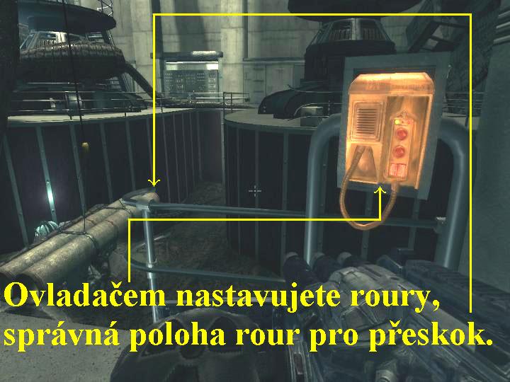 Nahoře si z výtahu vystupte, jděte chodbou doleva, vykopněte dveře, pokračujte chodbou dál, vykopněte další dveře. Po schodištích seběhněte až dolů, kde si vyslechněte monolog generála. Jakmile se vykecá a odstoupí od dveří, vykopněte je, seskočte si dolů, postřílejte zárodky bestií, dřív než se z nich vylíhnou mutanti, projděte úzkou průrvou vpřed kolem generátoru, nyní se musíte dostat až k poslednímu generátoru. Nejprve ale musíte dojít k prvnímu generátoru, takže si přeskočte doprava, vylezte nahoru po žebříku až k ovladači, vezměte ho do ruky (E), poté posunujte roury tak (klávesami W, A, S a D), abyste přes ně mohli přeskočit na druhou stranu ke generátoru (obr.4). K další generátorům se ale dostanete jen po chapadlech, takže na každý další generátor si vylezte po schůdcích nahoru, odtam si přeskočte na chapadlo a přeskákejte po něm k dalšímu generátoru. To opakujte stále až do té doby, než se takto dostanete až k poslednímu generátoru. Tak se dostanete až ke kabince, ve které sedí mechanik, který ji bude obsluhovat. Vyběhněte tedy po schůdcích nahoru na plošinu a vyčkejte, až se mechanik s plošinkou rozjede vpřed, Nyní musíte při jízdě dopředu likvidovat poletující bestie a mutanty, včas si z bedýnky dobírejte munici, o kus dál vás napadnou i přerostlé poletuchy, které rovněž likvidujte. Nakonec se vám postaví do cesty i obrovská příšera, kterou je Oktakrál, kterou rovněž zabijte, dobře se kryjte a včas si dobírejte z bedny munici. Jakmile se zbavíte i této potvory, posuňte se doleva a přeskočte si vlevo na úzký výklenek, po kterém se vydejte dopředu, vstupte k mrtvole Oktakrále, vykopněte po sobě dvoje dveře, skočte na výtahovou kabinku, z ní pak na nižší a z této do vody.