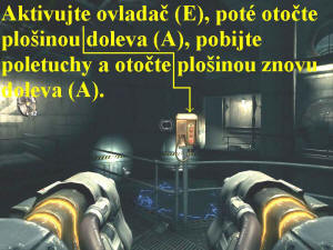 Popojděte vpřed k drátěné brance, spatříte vystraženého chlapíka, který se chce dostat přes branku k vám, což se mu nedaří. Vtom přiletí bomba, která muže roztrhá na kusy, ale zároveň i vyrazí branku, takže můžete vstoupit do tunelu. Projděte jím až na konec, dojdete do místnosti, kde postřílejte všechny monstra, ostatní potvory a jejich zárodky. Jakmile místnost vyčistíte, stoupněte si na odrazovou houbu, tak budete vyneseni nahoru na ambit. Z něj pak seskočte dolů, pobijte mutanty a jiné bestie, opět včetně jejich zárodků, po žebříku si vylezte na malé lešení, které se nachází vpravo u zdi. Z lešení si poté přeskočte na rouru, vydejte se k chapadlu, po němž opatrně přejděte na druhou stranu, odtud po další rouře vskočte do kulatého otvoru, který vede do potrubí. V něm pokračujte vpřed, držte se stále levé strany, na konci potrubí pak rozstřelte mříž a slezte dolů na rouru. Seskákejte dolů až k bazénu s vodou, do vody však probíjí elektrický proud. Pokud špatně vidíte, zapněte si Dukovo vidění (F), neboť nyní musíte po cívkách s kabely bezpečně přeskákat na druhou stranu, každý pád do vody je totiž vaše neodvratná smrt elektrickým proudem. Na druhé straně vstupte do chodby, jíž projděte ke dveřím, které vykopněte, tak se ocitnete v mechanické místnosti. Přes místnost pojděte na druhou stranu, kde vykopněte další dveře, vyjděte jimi ven na malou šikmou rampičku. Z jejího konce přeskočte doleva na rouru, po dalších rourách přejděte až na ambit, kde se setkáte s umírajícím vojákem, který vás ještě dříve, než umře, požádá, abyste splnili úkol zničit přehradu za něj. Poté, co umře, slezte po žebříku vpravo na nižší ambit, aktivujte ovladač a natočte ambit doleva (E a pak A) (obr.5). Otáčení ambitu se po chvíli ale samo přeruší, zato vás ale napadne houfec poletuch, které musíte zlikvidovat. Zde se nelze nikam ukrýt, takže jediné východisko z této nelehké situace je, dobře a přesně mířit, hlavně pak co nejrychleji střílet, naštěstí máte zde alespoň bednu s municí, takže nouzí o náboje trpět nebudete. Poté, co se poletuch zbavíte, opět uchopte ovladač a dokončete otáčení, tentokrát se ambit zastaví sám na správném místě. Jděte dopředu, kde jiskří elektrické výboje, rychle přeběhněte k páce, kterou přehoďte, tak vypnete elektrický proud. Vraťte se teď nazpět k ovladači, skočte do vody, plavte pod vodou k ventilu, kterým otáčejte doleva (E a potom A), tak si otevřete mohutný poklop u dna, kterým proplujte do další části hry.