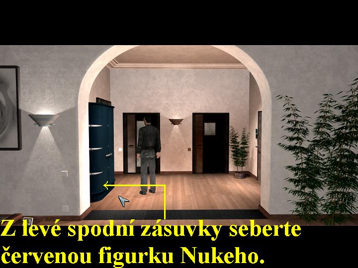 Jakmile skončí úvodní animace, kdy kukátkem ze dveří vašeho bytu spatříte, jak maskované komando SWAT vystupuje z výtahu ve 23. poschodí, pěkně ve vás zatrne, ale toto násilím vnikne do bytu vašeho souseda, vyrazí dveře a souseda odvleče zpět do výtahu, zatímco jeho manželku a malého synka hrubě zastrčí zpět do bytu, se ocitnete v reále na chodbě. Nejdříve ze všeho seberte ze země chlapcovu hračku, tedy malého medvídka, tak ho dostanete do vašeho inventáře, kde už máte naplněný, tedy funkční zapalovač (menu vyvoláváte klávesou Escape, záznamník vyvoláváte klávesou M, nápovědu klávesou H, prohlížíte předměty pravým tlačítkem myši a akci provedete levým tlačítkem myši). Prohlédněte si zvonek u sousedových silně poškozených dveří a tak zjistíte, že jméno souseda je Oswald a vzpomenete si, že tento oslovoval svoji manželku křestním jménem Deborah, familiérně pak Debbie. Ještě si prohlédněte poničené sousedovy dveře, vstupte dovnitř a několikrát po sobě se snažte zaklepat na dveře z předsíně do bytu, nikdo ale na vaše klepání nereaguje. Vraťte se tudíž nazpět do vašeho bytu, jděte do ložnice a z nočního stolku si vezměte záznamník, v inventáři ho klávesou M dostanete z inventáře na hrací plochu. Klikněte na zelenou ikonku telefonu, potom ne levou horní bílou šipku, znovu na zelenou ikonku telefonu, nyní se vám ohlásí placená Informační služba. Pracovnici, která se vám teď ohlásí se zeptejte na číslo záznamníku paní Deborah Oswaldové, poté co vám ho slečna s Informační služby sdělí, ikonkou červeného telefonu si je uložte. Abychom si tedy rozuměli, oběma bílými šipkami vyhledáváte uložená čísla ve vašem záznamníku, ikonkou červeného telefonu nově získaná čísla ukládáte a zelenou ikonkou, po vyhledání příslušných čísel a po výběru čísla bílými šipkami, čísla voláte. Nyní tedy zavolejte paní Oswaldovou, ale ta s vámi nebude chtít hovořit, je v šoku a nedůvěřuje vám, chce položit sluchátko. Rychle ji požádejte o chviličku posečkání, sdělte jí, že máte u sebe medvídka jejího synka, tak svolí s tím, že vás do bytu vpustí. Vyjděte tedy ven z vaší garsonky na chodbu, přes poničené dveře vstupte do sousedova bytu a znovu zaklepte ne dveře, tentokrát vám již Debbie otevře a vpustí vás dovnitř. Předejte ji hračku medvídka, bude ráda a dozvíte se, že její malý synáček Tommy je velice předcházejícími událostmi stresovaný a moc se bojí, není s ním žádná rozumná řeč. Dozvíte se také, že sama už volala na Polici a ač je to velice podivné, nikdo tam o žádném policejním zásahu nic neví. Sdělíte jí, že se tedy na policejní razii v jejich bytě zeptáte sami, přes chodbu se vraťte zpět do vašeho bytu, kde v předsíni z dolní levé modré zásuvky seberte červenou gumovou figurku Nukeho0000006729_n01.jpg (68113 bytes) (obr.1). Vytáhněte váš záznamník, opět se spojte s Informační službou a vyžádejte si od slečny číslo na Policii, poté se spojte s policejním důstojníkem. Nebude vám chtít dát přesné údaje a informace, sdělí vám ale, že ve vaší ulici se žádná policejní akce nekonala. Spojte se teď s paní Oswaldowou a sdělte jí, co jste se dozvěděli od policejního důstojníka, poté ji přislibte, že se ráno poptáte na celou záležitost v kiosku u prodavače.Jděte do ložnice, sedněte si za počítač, spusťte ho, tak si zcela nevázaně promluvíte s vaší přítelkyní jménem Kristýna, po skončení hovoru přistupte k oknu a otevřete ho, zjistíte, že je noc a na ulici je klid a mír. Jsou dvě hodiny ráno, je tedy nejvyšší čas ulehnout do postele a prospat se.