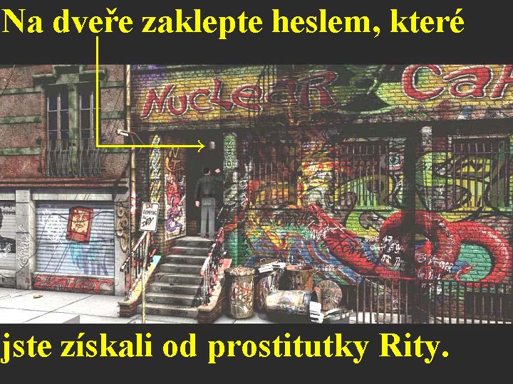 Poté, co automaticky vystoupíte z taxíku, vyslechnete si hromadu nadávek a výhružek, směřujících přímo na vaši osobu, no „psí hlas“ do nebe nevolá, ne? Prohlédněte si oba ukazatele směru a všechny plakáty, jděte k vraku auta a tak přijdete ke dvěma výtečníkům, jsou to „nefachčenci“ a zlodějové. Promluvte si s tím od vás vpravo, zjistíte, že se jmenuje Juan a brzy také přijdete na to, že je to ten horší z této povedené dvojice. Jako vždy i s ním proberte všechny nabídky z dialogů, využije vaší nepozornosti a ukradne vám váš záznamník, koukejte dobře, kam s ním utíká, budete se tam muset za chvíli vydat i vy. Ještě než tak učiníte, promluvte si i s druhým paskřivcem jménem Mike, vytáhněte z něj všechny informace, které je ochoten vykecat, bude se vám to nesmírně hodit. Nyní se již tudíž můžete vydat dolů po ulici směrem k baru NUCLEAR CAFE, spatříte, že od tam vychází Juan, který vás před chvílí okradl a zřejmě si za váš kredit hodně věcí nakoupil. No zatím to nechejte tak, jděte ke vchodu do baru a několikrát na jeho vchodové dveře zaklepejte, nikdo však neotevře. Naproti na chodníku stojí šlapka jménem Rita, jděte tedy k ní a vytáhněte z ní při rozhovoru vše, co se dá, každá informace je dobrá. Pokud budete postupovat chytře, vykecá vám i to, že do baru se dostanete jen zvláštním zaklepáním na dveře, tedy smluveným heslem. Jděte tudíž znovu k barovému vchodu a zaklepejte na dveře smluveným heslem, které vám prozradila Rita0000006729_n02.jpg (121520 bytes) (obr.2), nyní vám již bude otevřeno, takže vejděte dovnitř. Pohovořte si s dalším výtečníkem, kterým je majitelem baru, jmenuje se Lou a je to darebák první třídy. Proberte s ním všechny nabídky rozhovorů, trošku i vyhrožujte, tak vám prozradí, že váš záznamník leží o kousek dál naproti na stolku. Seberte ho tedy a znovu jděte k Luovi, ukažte mu fotografii Oswalda a tak tento zavolá na svého komplice Cyphera, který se rozhodne vás přijmout. Vydejte se tedy za ním do komory a s Cypherem proberte všechny otázky. Nakonec mu ukažte fotografii Oswalda, s podivem zjistí, že tento stojí při fotografování u nějaké podivné antény. Víc vám nechce říci a požádá vás o protislužbu, odevzdá vám reklamní CD-čko AAC a chce po vás, abyste mu zařídili u vašeho šéfa v agentuře hodinové vysílání ze záznamu na tomto CD. Prohlédněte si tedy v jeho kumbálu vše, co lze, zvláště jeho pracovní stůl, poté se vraťte zpět do baru a vyjděte dveřmi na ulici. Jděte zpět k vašemu taxíku, nasedněte si a jako cíl jízdy zadejte Centrální Manhattan.