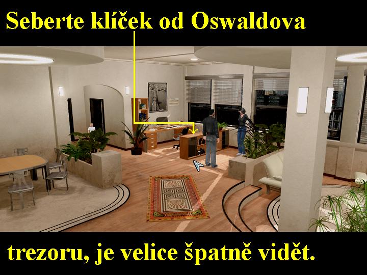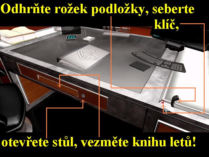 Po vystoupení z taxíku, vyjděte rovnou po schodišti k hlavnímu vchodu, na terminál vpravo znovu použijte váš záznamník, tak si otevřete vchod a vejděte do haly. Robota Blaire si nevšímejte, už vám dá pokoj, jděte tedy přímo k výtahu, stiskněte tlačítko, nastupte si, tak vyjedete do kanceláří. Nejdříve si pokecejte s Billem, najdete ho od recepce po levé straně, pracuje tam s terminálem. Vaši, tudíž i jeho kolegové budou do vás „vrtat“, což přejděte s vysokým nadhledem, něco takového vás přece nemůže rozhodit. S Billem proberte všechny možnosti rozhovorů, hlavně se nezapomeňte zeptat, jestli by vás alespoň na chviličku nenechal pracovat s terminálem, odmítnete s tím že je hladový, musí práci dokončit a také se najíst. Billa musíte „masírovat“ tak dlouho, pokud se nerozhodne pro to, abyste mu dovezli jídlo z „Life Life“, které se však potom napřed musí ohřívat v mikrovlnné troubě. Vydejte se tudíž přes výtah ven před budovu, nasedněte do taxíku a jako cíl cesty udejte Brooklyn, kde si vystupte. Jděte ke stánku Boba, pokecejte si o všem, o čem lze, poté si od něj přes všechny jeho výhrady ke „kvalitě“ tohoto jídla kupte „Life Life“, které požadoval Bill. Vraťte se zpět do taxíku, udejte jako cíl jízdy Centrální Manhattan a vám již dobře známou cestou se vydejte do kanceláří. Hned vpravo od recepce je pojistková skříňka, otevřete ji, tak zjistíte, že jedna z pojistek je spadlá (OFF), přehoďte ji tudíž nahoru (ON). Jděte vpřed, zabočte doprava, vpravo od točitých schodů se nalézá malá kuchyňka. Vstupte do ní dveřmi, hned po levé straně od nich je elektrická zástrčka, do ní vstrčte elektrickou šňůru od mikrovlnné trouby, jděte k troubě a vložte do ní z inventáře u Boba zakoupené jídlo. Ohřívání jídla nastavte na dvě minuty, zapněte troubu pravým knoflíkem, zkontrolujte na monitoru, že ohřev probíhá a vydejte se k Billovi. Řekněte mu, že oběd pro něj se již ohřívá, tak se sebere půjde do kuchyňky, tím vám uvolní terminál, ke kterému nyní můžete přistoupit. Do zásuvky dole vložte CD od Cyphera, musíte však vyčkat, až se vám objeví správný kód, tedy A4325, poté již můžete terminál opustit. Mezi tím se už Bill vrací k vám zpět, pokecejte s ním, nezapomeňte se zeptat na jídlo, poté se s ním rozlučte, vyjděte před budovu, nasedněte do taxíku a udejte cíl cesty Lower East Side, kde si vystupte. Jděte rovnou bez zdržování do Nukleární restaurace, zaklepejte na dveře, heslo znáte, takže budete bez problémů vpuštěni dovnitř. Nezdržujte se a jděte přímo do komory za Cypherem, odpovězte mu na všechny jeho otázky a poté mu sdělte, že jste jeho přání splnili. Znovu vám potvrdí, že Oswald na fotografii stojí u parabolické antény, ale nyní vám sdělí i umístění antény, tato se nachází v Seti Aracebo v Portoriku. Zjistíte ale, že to už věděl před tím, je to holt vyděrač. Ze záznamníku tedy zavolejte paní Oswaldovu, opět proberte všechny nabídnuté dialogy, hlavně ji nezapomeňte sdělit vše, co jste se dozvěděli od Cyphera o fotce jejího manžela. Tak se od ní dozvíte o letištním „Terminálu B“ v JFK, odkud odlétají letadla do Portorika. Tak to jste potřebovali vědět, opusťte bar, jděte k taxíku a vraťte se v něm do Centrálního Manhattanu, vstupte do vaší agentury a výtahem vyjeďte do kanceláří. Pokecejte si s ním o všem, co lze, nyní je ale hlavní se zeptat na vašeho šéfa Greenberga, tak se dozvíte, že tento odletěl do Pekingu, což je tedy příležitost pro vás. Po točitých schodech vyjděte až nahoru, kde přistupte ke stolu vašeho šéfa a prohlédněte si ho zblízka. Na gumové podložce je odchlípnutý levý rožek, odhrňte ho, tak získáte klíček od šéfova stolku., kterým otevřete šuplík od pracovního stolu šéfa0000006729_n03.jpg (71602 bytes) (obr.3), v něm objevíte registrační knihu letů, kterou seberte. Máte tedy co jste chtěli a potřebovali, vraťte se tudíž ven před budovu a opět nasedněte do taxíku, objevil se vám na displeji nový cíl, JFK AIRPORT, tam se potřebujete nyní dostat. Před letištěm vystupte z auta, vyběhněte po schodišti, vstupte do dveří s nápisem DEPARTURES, zde si prohlédněte hodiny vpravo nahoře, právě jste zjistili datum a čas odletu vašeho letadla. Můžete si prohlédnout celé zařízení a vybavení letiště, stojí to za pohled, času máte dost a letadlo bez vás neodlétne. Po dalším schodišti rovně před se pak vydejte k tabuli s označením TERMINAL B, na registrační tlačítko terminálu vložte z inventáře registrační knihu letů a teď jen sledujte v následující animaci z okénky letadla mraky pod vámi.