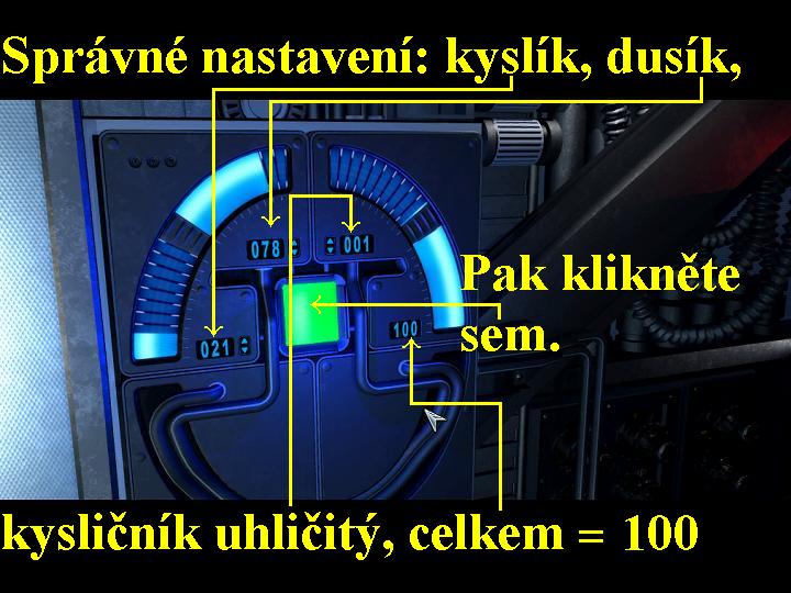 Jakmile se ocitnete ve vstupní hale Lunaru 5, nejdříve si pohovořte s Lindou, během pobytu zde bude vaší asistentkou. Budete hodně překvapeni, neboť zjistíte, že o vás ví všechno do nejmenších podrobností. Poté co vás vyzve, abyste šli do baru na koktail, se ocitnete ve vaší kabince číslo 28. Postupně stiskněte vlevo ode dveří všechny tlačítka s čísly 1 až 3, tak zjistíte, které k čemu slouží. Koukněte se vpravo z okna, tak si prohlédnete z velké dálky Zemi, jděte ke dveřím umývacího koutku, přibližte si ho a vezměte si kelímek a ručník. Pak odstupte a vyjděte na chodbu, pokračujte dolů, zabočte dvakrát po sobě doleva a tak dojdete k bazénu, odtud se vydejte doleva a tam se setkáte znovu s Lindou. Proberte s ní všechny varianty dialogů a dozvíte se velice prapodivné věci, mimo jiné i pochopíte, že jste zde vlastně uvězněni. Po skončení rozhovoru se vydejte do rekreační oblasti, promluvte si s paní Wintrovou, to je ta madam s překrásným jorkšíráčkem v náručí. Zjistíte velice snadno, že by vás nejraději „sbalila“, zřejmě se nudí a nějaký ten flirt pro rozptýlení by jí přišel více než vhod. Vraťte se znovu l Lindě a pohovořte s ní znovu o všem, hlavně se jí však přeptejte na paní Wintrovou, poté se vraťte zpět do rekreační oblasti a pokecejte si s mužem v bílém plášti, dozvíte se tak, že je to zdejší lékař, tedy doktor Jenkins. Je to velice nerudný pán, kterého najdete vždy na tomto postu, anebo pokud zde nebude, pak posedává u baru, kde popíjí kávu. Proberte tedy s ním všechny dotazy, sice se mnoho nedozvíte, ale ubezpečíte se v tom, že je to ještě navíc cynik. Poté pokračujte dál kolem bazénu, přejděte na jeho druhou stranu, vstupte po schodišti do baru, vlevo stojí muž v teplákové soupravě, tedy pan Stiller. Pokecejte i s ním, proberte všechny možnosti dialogů, hlavně se však zeptejte, zdali by vám mohl pomoci, anebo vám dokonce odtud utéci, obojí striktně odmítne. Kousek od něj dál je tácek s již namíchanými koktaily, jeden z nich tedy seberte a v inventáři si ho prohlédněte, tak spatříte na dně koktaily nějaké prášky. Kolem doktora sedícího nyní u baru projděte zpět do vstupní haly, promluvte si opět s Lindou, hlavně se jí zeptejte na pana Stillera. Vraťte se nazpět k baru a uvidíte doktora, jak velice hrubým způsobem napadl a urazil barmanku, je to prostě neurvalec.Vracejte se tedy známou cestou zpět do vstupní haly, vydejte se k bloku s kabinkami a kolem druhého bazénu se dostanete nazpět do chodeb. Jděte zpět k vaší kabince, jistě vám nemusím zdůrazňovat, že má číslo 28, přitlačte dlaň na skener a tak dveře otevřete, vstupte dovnitř. Jděte ke stolu, přistupte k němu blíž, na stůl položte kelímek a přikryjte ho ručníkem, přes něj přelijte obsah z koktaily. Na ručníku uvázly nějaké prášky, seberte je, vezměte si zpět ručník i kelímek a od stolu odstupte. Nyní ručník použijte na větrací okénko nade dveřmi, stiskněte tlačítko 3, tak se dozvíte, že při přelévání koktaily přes něj se v něm zachytilo cosi, co kazí vzduch ve vaší kabině. Hlavně si teď zapamatujte vám ohlášeného složení vzduchu v kabině, je to 21% kyslíku, 78% dusíku a 1% kysličníku uhličitého. Seberte teď ručník a vraťte se známou cestou zpět do baru, jděte k oblíbenému místa doktora, kde kromě postávání na kraji rekreační oblasti velice rád popíjí kávu. Jestliže u baru sedí, tak se vraťte na okraj vstupní haly a hned zpět k baru, tak už tam sedět nebude. Otevřete inventář a nožem tabletky rozdrťte, poté takto získaný prášek vysypte do doktorova šálku. Opět se vraťte na začátek vstupní haly a ihned nato zpět k baru, spatříte, jak si doktor „pochutnává“ na vámi vylepšené kávě. Udělá se mu po chvíli velice špatně a prohlásí, že si jde lehnout a odejde. Tak to je ta pravá chvíle pro vás, prohlédněte si zblízka bar pult a zjistíte, že na něm doktor v tom kalupu zapomněl rádiový vysílač. Znovu se vraťte k druhému bazénu a od dveří ke vstupu do haly vpravo jsou dveře, které si prohlédněte, je zamčeno. Vpravo od nich je malý kryt, na něj použijte doktorův rádio vysílač, tak krytku odkryjete, pod ní stiskněte červené tlačítko, tak dveře otevřete a vstupte dovnitř, teď jste se ocitli ve strojovně. Nad dveřmi s označením LOCKED je průzor, nahlédněte jim dovnitř, ale pro tmu nic neuvidíte, přepínací panel je také nefunkční. Jděte na druhou stranu strojovny, zblízka si prohlédněte modrý panel vpravo, nyní musíte přestavět na panelu hodnoty tak, jak jste je získali po překrytí větracího okénka ručníkem ve vaší kabince. Tak tedy, hodnoty vlevo dole nastavte šipkami na 21 pro kyslík, vlevo nahoře 78 pro dusík a nakonec vpravo nahoře pro kysličník uhličitý 1, pokud jste vše nastavili správně, pak vpravo dole musí být celková hodnota 1000000006729_n05.jpg (77183 bytes) (obr.5). Tak se uprostřed panelu rozsvítí zelené tlačítko, klikněte na něj a nyní se vám otevřel výtah, do kterého si nastupte, sjedete dolů a vydejte se po lávce dopředu. Všimněte si vpravo podivných předmětů s červenými světélky, poslední předmět z vašeho pohledu je neosvětlený. Přistupte tudíž k tomuto, přibližte si ho a vyndejte z něj nástroj a energetický článek, obojí je poškozené a tudíž zcela nefunkční. Vlevo na výrobním pásu přijíždějí ke konečné montáži vznášedla, přejděte tedy k nim, jděte kousek dolů a vytupte na pás, odkud jsou vozítka po konečné montáži odbavována k letu. Počkejte, až přijedou k vám, jedno si přibližte a obě vadné součástky vyměňte ve vozítku za dobré. Takto vámi upravené vznášedlo sice také odletí, ale j