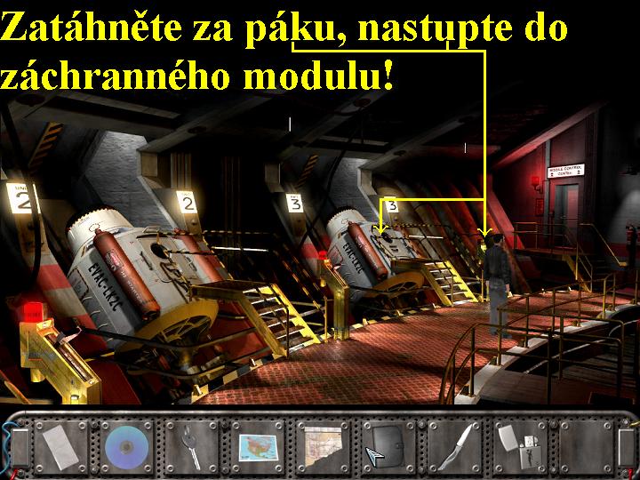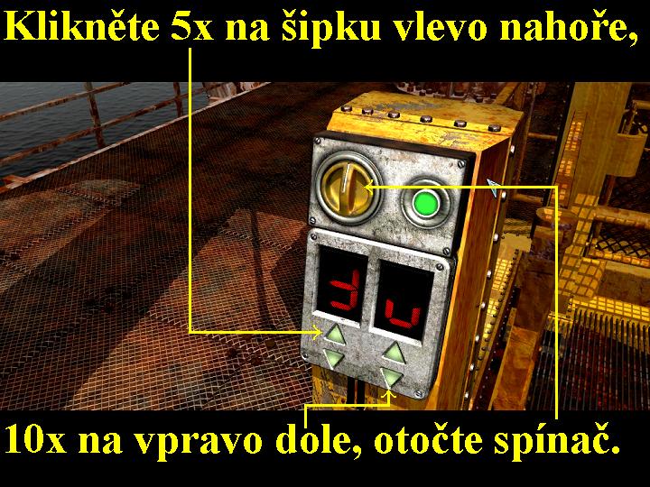 Nejdříve se dejte doprava, dojděte až ke generátoru, všimněte si vlevo od něj výtahové plošiny. Nastupte si do ní, automaticky stlačíte výtahový spínač, ale výtah se ani nehne. Takže co teď? Jistě jste dali na moji radu, abyste si pečlivě pročetli a prozkoumali Oswaldův deník, pokud jste tak učinili, potom byste měli již sami vědět, jak na to. Vystupte si z výtahové plošiny, jděte ke kódovacímu panelu, přibližte si ho a tak na něm uvidíte čtyři šipky, zelené tlačítko a otočný spínač. Nejdříve tedy panel aktivujte zeleným tlačítkem, potom pětkrát po sobě klikněte na šipku vlevo nahoře, nato desetkrát na šipku vpravo dole, nakonec otočte otočným spínačem, teď by měl být již výtah funkční0000006729_n06.jpg (105135 bytes) (obr.6). Odstupte si od panelu, znovu nastupte do výtahové plošiny, opět automaticky zmáčknete výtahový spínač, ale tentokráte již výtahem nahoru vyjedete. Jděte ke dveřím, zkuste zadat stejným způsobem už mnou popsaný kód, ale neuspějete, dveře stále nejdou otevřít. Vraťte se tedy zpět k výtahové plošině, nastupte si a sjeďte dolů, dejte se doleva k druhému výtahu vpravo na konci. Zde už vám kód vámi zadaný bude fungovat, takže ho zadejte, nastupte si a ve výtahu vlevo zatáhněte za žlutou páku, tak sjedete dolů. Po vystoupení jděte po schodech dolů a dobře si prohlédněte gumový člun. Vraťte se po schodech zpět nahoru, opět zadejte správný kód a poté, vpravo použijte žluté tlačítko, tak prázdný výtah odjede zpět nahoru. Posečkejte chvíli, až se výtahové dveře otevřou, pak vejděte do výtahové šachty a z levého koutku seberte potápěčskou výstroj. Sejděte znovu po schodech dolů, nyní už můžete do člunu nastoupit, z inventáře na sebe použijte potápěčskou výstroj a rozjeďte se k prostřednímu sloupu. Jakmile se vám u sloupu ukáže ikonka pro potápění, klikněte na ni, tak se potopíte pod hladinu a plavte k tabuli, přečtěte si ji, zjistíte že všechno je pod vysokým elektrickým napětím. . Prohlédněte si víko skříňky, pákou si ji otevřete a poté přehoďte pákový spínač, teď jste vypnuli elektrický proud. Nyní už tedy můžete vyplavat na hladinu, nastupte si do člunu a plavte k výchozímu místu, kde z člunu vystupte a po schodech vyjděte znovu nahoru, vám už dobře známým způsobem si výtah přivolejte, nastupte do něj a vyjeďte nahoru. Jděte ke dveřím, nyní jimi již projdete, vstupte dovnitř, jistě jste poznali už sami, že se nacházíte ve strojovně. Po levé straně si prohlédněte všechny monitory, tak se dozvíte, že tato základna je ve skutečnosti velice silný a výkonný vysílač. Z dalšího monitoru získáte informaci, že je zaměřen na Severní Ameriku, prostřední panel pak vám ukazuje jakési souřadnice N-50023 stupňů. Prohlédněte si buben s kabely vepředu, získáte tak další velice zajímavou informaci a to, že základna byla postavena již ve 20. století. Z vašeho pohledu vlevo u východových dveří seberte lano, vyjděte ven, sjeďte výtahem dolů a vydejte se znovu k výtahu v pravém rožku, kterým sjeďte dolů ke gumovému člunu. Opět si oblékněte potápěčskou výstroj, na člunu plavte k prostřednímu sloupu , kde seberte na hladině plovoucí minu, ale pozor, může být i kousek pod hladinou. Spustí se animace, v níž dopravíte minu nahoru na plošinu, zde přivažte na ni jeden konec lana, v animaci pak přivážete druhý konec na lano pro vstup do vzducholodi, tak se spustí animace, v níž plošinu vyhodíte do povětří, po jejím skončení vylezete dovnitř vzducholodě. Přejděte do její zadní části, nahoře na stropě otevřete pákou poklop a vlezete si dovnitř, tak se schováte.