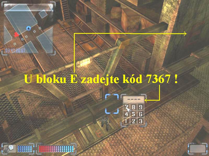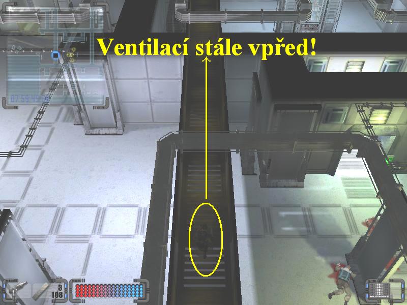 likvidujte vojáky. Propleťte se mezi uličkami a pokračujte chodbou doprava,