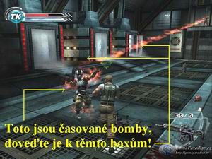 strelbou do červených sudov. Vyčistite oblasť (pozor na raketometčíka)