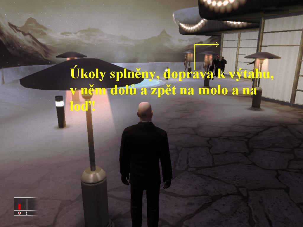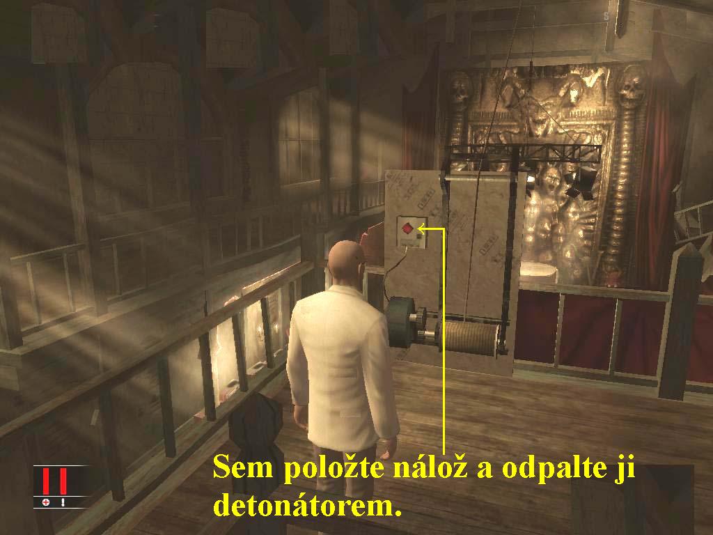 Hned na začátku vás musím upozornit na to, že tato mise je ve skutečnosti tutoriálem, kde se musíte naučit ovládat vlastní postavu a využívat všechny možné triky a fígle, které se vám později budou velice hodit, Doporučuji vám proto, abyste tuto výuku odehráli přesně podle mého popisu, jen tak získáte všechny možnosti a dovednosti a navíc, také se nemusíte obávat jejího ohodnocení, s čímž se setkáte až v ostatních misích, kdy budete hrát už „naostro“. Po skončení úvodní animace se tudíž vydejte doleva, zabočte vlevo a hned nato dvakrát doprava a vydejte se dopředu k bráně. Jakmile se před ní zastavíte, spustí se animace, v níž si pokecáte s vrátným a pošlete ho na onen svět, v reále bránou projděte, odbočte vlevo a vstupte do dveří s nápisem GIFT SHOP. Odbočte doprava a projděte k dalšími dveřím, kde vidíte za oknem dva bandity. Vyberte z inventáře minci a prohoďte ji oknem, čím déle ji podržíte, tím dále ji hodíte, potom bez obav projděte dveřmi, označenými jako GIFT CERTIFICATES AVAILLABLE, pokračujte vpřed a vstupte do dveří s nápisem THEATER. Opatrně se plazte vpřed, abyste nevzbudili pozornost gangstera, zezadu ho uškrťte strunou (lankem z inventáře), seberte mu zbraň (to dělejte u každé mrtvoly, dále už na to nebudu upozorňovat), jděte doprava a po mřížovaném rastru se vyšplhejte nahoru. Na konci se přehoupněte přes zábradlí, seberte brokovnici a projděte dveřmi vlevo. Zbavte se dvou darebáků, jejich těla ukryjte do beden, ukryjte se do skříně a vyčkejte, až si za stůl sedne chemik, i když je neozbrojený, uškrťte ho, převlečte se do jeho šatů, potřebujete jeho elektronickou kartu, kterou mu po jeho skonu seberte. Vstupte do chodbičky v převlečení chemika, kartu použijte vlevo na dveřní zámek, po projití dveřmi se pokuste projít dál po rampě, v převleku chemika by vám to mělo vyjít. Popojděte vpřed a za dveřmi vlevo si vyzbrojte, do bedýnky s prášky do pečiva si vložte pistoli a bedýnku si vezměte, vyjděte ven a pokračujte dopředu k druhému strážci, ten vás prohlídne, zda nemáte zbraň a pustí vás dál, vstupte tedy vlevo do kontrolní místnosti, kde bedýnku zahoďte, zbraň si však z ní seberte. Po skončení animace seskočte do výtahové šachty, pod vámi strunou uškrťte banditu a jeho mrtvolu vytáhněte na kabinku výtahu a seskočte zpět až dolů. Jděte dopředu, poškoďte elektrickou skříňku, v následující tmě se pližte do haly, pokračujte opatrně vpřed levou stranou při zdi, abyste na sebe neupozornili. Podle cedulky s panáčkem se dostanete na toalety, vstupte dovnitř, tam vykonává malou potřebu bandita, otočený k vám zády. Připravte si pistoli, opatrně k němu přistupte a uchopte ho rukou, získali jste lidský štít a pravou rukou můžete střílet s pistole. Teď jste připraveni vstoupit do místnosti za záchodky, kde velmi lehce zastřelte chráněni živým štítem tři gangstery, poté skolte i toho vašeho. Můžete se vrátit zpět na toalety, kde pod umývadlem zůstal banditův samopal, seberte ho. Vylezte nahoru po žebříku, kde seberte kufřík s odstřelující puškou, kufřík otevřete a vyjměte sniperku, z okna zlikvidujte tři gaunery dole na zemi, na střeše a na věžičce. Jakmile natáhnou brka, vraťte se kousek zpět a mezerou v zábradlí jděte do protisměru ke dveřím, přes které projděte. Pokračujte vpřed a sklouzněte se dolů po okapové rouře, držte se stále vlevo a na konci projděte do kanceláře dveřmi s nápisem OFFICE. Pod schody naleznete injekce s jedem, které seberte a pokračujte dál po schodech nahoru. Počkejte si skryti při zdi, až si bandita se slečnou pokecá, ta odejde a bandita půjde k balkónu, tiše se k němu zezadu přikraďte a srazte ho dolů pěstí. Poté, co sekretářka bude hovořit se šéfem, vstupte do jeho kanceláře a jed stříkněte do nápoje, který má na stole. Můžete se schovat do skříně a poťouchle sledovat, jak se slečna napije a natáhne paprče. Po jejím skonu vylezte ze skříně, vstupte do šéfovy kanceláře, ukážete mu fotku, což bylo posledním přáním klienta a Swing Kinga zabijte libovolným způsobem, vaší fantazii se meze nekladou, poté vylezte z kanceláře oknem ven. Venku na balkóně seberte minu a detonátor, přejděte po balkóně až na druhý konec a otevřeným oknem se vsoukejte do haly. Zde se nachází zařízení, které přidržuje divadelní konstrukci, je to jakási kladka. Přistupte k ní, uložte na ně minu0000007270_n01.jpg (95907 bytes) (obr.1), poodstupte si a detonátorem ji odpalte, tak se zmíněná konstrukce zřítí a pozabíjí dole pod vámi gangstery, jejich šéfa už potom dorazte podle vaší chuti sami jakýmkoliv způsobem. Sejděte po schodech dolů a vydejte se ke dveřím s nápisem EXIT, tak se spustí animace, po jejím skončení se nakrátko ocitnete v HIDEOUT, což je sklepní kryt, kde si můžete vyzkoušet po vybrání zbraní střelbu na terče, poté vystoupejte na vámi po schodišti až ke dveřím, tak tuto misi ukončíte. Naskytne se vám výběr z tabulky si vybrat zbraně podle množství peněz, které vlastníte a po další animaci přejdete do další mise. Ještě než se pustím do další, tedy vlastně do první skutečné mise, chtěla bych vám sdělit, že nyní jste se naučili využívat všechny schopnosti vaší postavy. Každá mise končí hodnocením a ziskem peněz, za které si lze dokoupit různé užitečné předměty. Misemi můžete procházet přímočaře, tedy si cestu prostřílet, což vám nedoporučuji, neboť byste nejenže přišli o požitek ze hry, ale vaše hodnocení by bylo prachmizerné, o zisku peněz ani nemluvě, doporučuji vám proto i nadále se držet mého návodu, i když ani na chvíli se nedomnívám, že by to byla cest