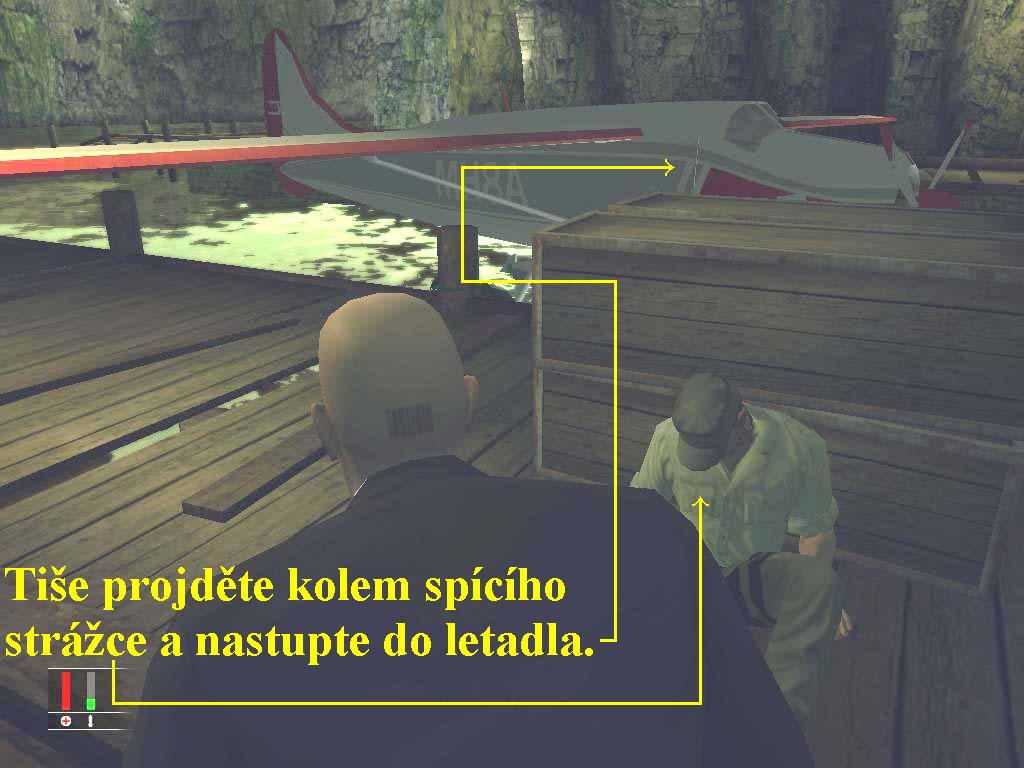 Ocitli jste se v Chile, vaším cílem je najít a zlikvidovat bývalého plukovníka Pinochetovy zpravodajské služby, jehož jméno je Don Fernando Delgado. V současné době řídí rozsáhlou fabriku na výrobu kokainu, což maskuje pěstováním hroznů na rozlehlých vinicích. Snímky ze satelitních družic jasně dokazují, že tajná továrna se nachází pod zemí. Delgadův syn Manuel Delgado obchoduje s kokainem také, takže musíte zabít i jeho, aby obě likvidace vypadaly jako tvrdý konkurenční boj. Do Santiaga se dostanete s klubem důchodců na oslavu Delgadovy nové značky, pojmenované podle „béčkové“ akční hvězdy osmdesátých let, Rex Stanton. Bude tam však přítomen i televizní štáb, takže dávejte pozor, ať vás nezachytí jeho kamery. Jakmile splníte zadané úkoly, můžete opustit vinice Delgadovým hydroplánem. Vydejte se doleva kolem zdi, na jejím konci odbočte doprava a kolem stráže jděte dopředu, tak dojdete ke skalním římsám, po kterých křížem krážem sejděte až dolů na molo. Tam sedí civilista, kterého raději pěstí shoďte do vody, dojděte ke strážnému VIP a zezadu jej tiše uškrťte strunou. Druhého civilistu, který se vozí výtahem, též srazte pěstí a buďto jej ukliďte až úplně doprava za bedny, nebo ho hoďte rovněž do vody. Převlečte se do obleku strážného VIP, nyní máte volný přístup do haciendy, vezměte si jeho samopal a přivolejte si výtah, kterým vyjeďte nahoru, zadejte uvnitř jako cíl laboratoř. Nahoře si vystupte, počkejte až přejde kolem vás strážný, odbočte vpravo a za rohem vpravo projděte dveřmi. Jděte stále dál, po schodech a přes několik dveří se dostanete do pokoje Fernando Delgada, který tam hraje na basu. Tiše se k němu zezadu přikraďte a usmrťte ho strunou, nebo injekcí, jeho mrtvolu potom shoďte z balkónu. Nyní se vracejte zpět na dvůr, kde dvoudílnými dveřmi vstupte do vinného sklípku. Po schodech seběhněte až dolů, Projděte všechny místnosti, tak najdete stůl, na kterém je hrstka kokainu, sem chodí občas Manuel fetovat. Počkejte si zde na něj, jakmile sem přijde, počkejte, až se strážný vzdálí a rychle Manuela usmrťte strunou, nebo jedem, jeho mrtvolu ukryjte dozadu za sudy do bedny. Musíte být ale velice rychlí, neboť strážný se za chvíli vrací a nesmí vás přistihnout. Poté se vydejte nazpět na dvůr a stejnou cestou jako na začátku seběhněte dolů k molu, na místě kde jste se převlékli se oblečte zpět do svého oděvu a tichým krokem se vydejte doprava k hydroplánu. Zde spí strážný0000007270_n02.jpg (97067 bytes) (obr.2), kterého si nevšímejte a stále tichým krokem nastupte do letadla, tak v animaci odletíte a tuto misi tak zakončíte. Zde jen malý dovětek, způsob, který jsem vám navrhla k likvidaci obou zlotřilců, je pouze jeden z mnoha možných, ale je nejjednodušší, neboť v uniformě stráže VIP máte přístup na všechny místa a pokud se neprozradíte sami, hladce projdete celou haciendou i vinným sklepem. Při volbě jiných alternativ se musíte častěji převlékat a hrozí vám daleko větší hrozba odhalení vašeho převleku, takže se rozhodněte sami.
