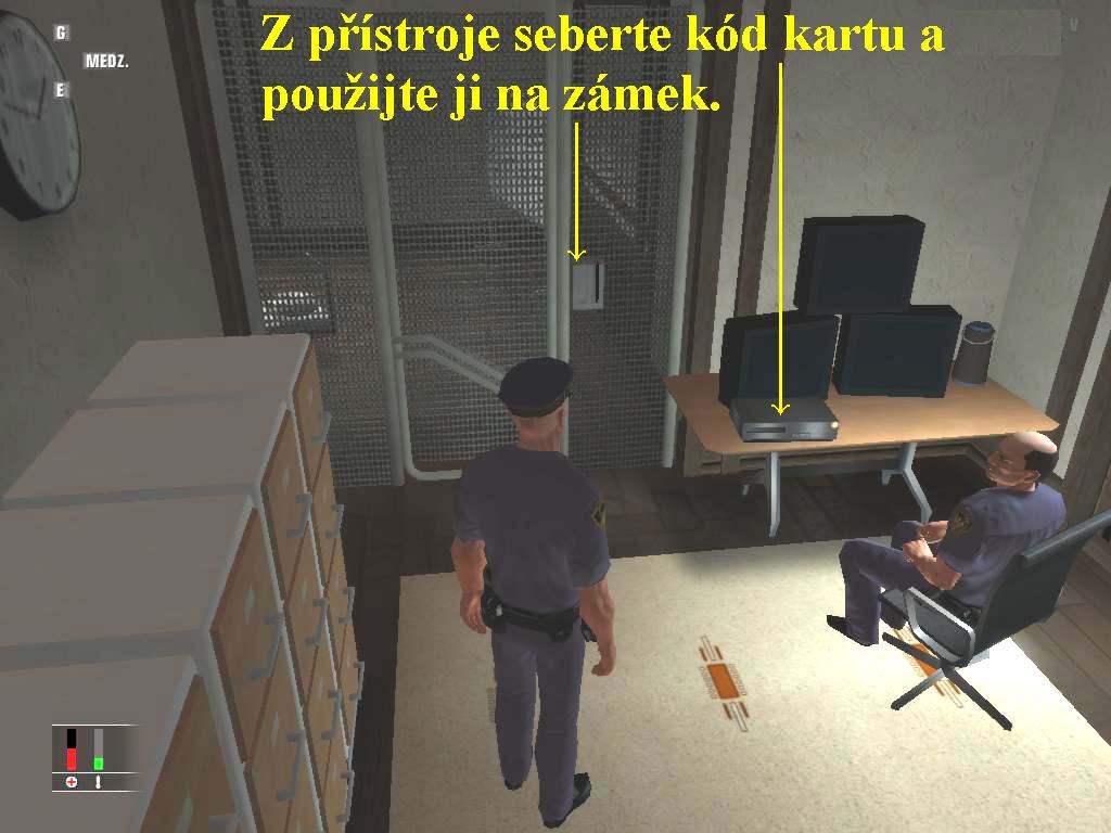 Vaši nadřízení vyslovují uspokojení nad tím, že jste všechny úkoly splnili a hlavně též přežili všechny nástrahy a velká nebezpečí. Další úkoly na vás čekají v Severní Kalifornii. Tři mafiáni se ubytovali na rehabilitační klinice pro léčbu alkoholiků, jeden z nich se rozhodl svědčit ve prospěch státu, jakmile bude propuštěn. Mafie se tomu ovšem snaží zabránit, ale neví, který z těch tří to je. Váš agent jménem Smith, nasazený na kliniku, aby vypátral totéž, se již několik dní neozval. Z kliniky však propustí jen ty pacienty, kteří budou střízliví, nebo zemřou. Smith je proto udržován ve stavu totální opilosti, takže ven ho můžete dostat jen jako mrtvolu. Proto jste obdrželi experimentální speciální sérum, takže pokud sérum do něj vpravíte, bude vypadat jako mrtvý. Máte též protijed, kterým ho lze později oživit, ale dávejte si pozor, na klinice je něco podivného a podezřelého. Jakmile skončí úvodní animace a ocitnete se v reálu, pokračujte po cestě nahoru a odbočte doprava ke kontejnerům, kde se injekcí zbavte lékaře, ale musíte být rychlí, dřív než se objeví strážný, musíte ho uložit do kontejneru. Počkejte si teď na strážného, pošlete ho tiše na onen svět injekcí, nebo strunou, poté si oblečte jeho uniformu a mrtvolu vhoďte do druhého kontejneru. Poté pokračujte dál nahoru po cestě, vlevo seberte z lavičky kartu a vydejte se ke vstupu do hlavní budovy, vlevo projděte dveřmi. Projděte jídelnou, za ní je uzoučká chodba, z ní se vydejte do druhých dveří po pravé straně. Tak se ocitnete v malé bezpečnostní místnosti, kde u počítače sleduje monitor policista. Seberte mu z přístroje kartu, kterou si ihned otevřete zámek od protějších dveří0000007270_n03.jpg (96957 bytes) (obr.3). Projděte chodbou a na konci si stejnou kartou otevřete další dveře a pokračujte dál. V místnosti nakoukněte do okna, pokud za stolem sedí pouze jeden ošetřovatel, vlezte okénkem dovnitř, usmrťte ho strunou a mrtvole seberte klíč, poté se převlečte do jeho obleku a tělo vhoďte vpravo od stolu do kontejneru. Projděte dveřmi do další haly, je to objekt s vězeňskými celami. Seběhněte po schodech až dolů a otevřete si získaným klíčem celu, ve které je zavřený vámi hledaný agent. Promluvte si s ním, dozvíte se, kde máte hledat vaši další oběť, v animaci obdržíte fotografii a zprávu o dalších potencionálních cílech a poté mu vpíchněte experimentální sérum, takže bude vyhlížet jako mrtvola. Aniž byste se převlékali, vraťte se známou cestou nazpět do centra a z recepce vstupte naproti do první vstupní místnosti. Jsou zde regály s knihami a uprostřed veliký glóbus, ve kterém má jeden z pacientů, kterým je hledaný kšeftař se zbraněmi schovanou láhev s chlastem a chodí se sem pravidelně „občerstvovat“. Pokud se zde právě nezdržuje, otevřete glóbus a do láhve mu z injekce stříkněte jed, o víc se nestarejte, můžete se ukrýt a pozorovat, jak si přihne a natáhne paprče, ale klidně můžete pokračovat dál. Nyní se vydejte za grázlem jménem Lozerno, který je vaším hlavním cílem, je iniciátorem únosů, obchodníkem s „bílým masem“, má na svědomí bezpočet znásilnění a jiných trestných činů. Vyjděte tedy z knihovny po schodišti naproti do poschodí a zde se vydejte do západní části, tam najděte dveře označené jako „D“ a projděte jimi. Poškoďte plynový sporák a až si sem přijde zmíněný padouch připravit něco k jídlu, sporák vybuchne a máte ho z krku. Nyní musíte vyhledat vaši poslední oběť, kterou je pašerák zbraní a drog. Ten si velice rád udržuje tělesnou konvičku, hodně cvičí a s oblibou se prochází. Jděte tedy zpět do vstupní haly, je to mezi knihovnou a recepcí a zabočte doprava. Tak se ocitnete v tělocvičně a nyní máte několik možností, jak ho poslat k čertu, aby to vyhlíželo jako nehoda. I tento všivák si potrpí na alkohol, takže u sošky, která s odpuštěním čůrá, má láhev, kterou můžete rovněž otrávit a máte i jeho z krku. Nyní vás už čeká jen velice jednoduchý konec mise, vraťte se na místo, kde jste nechali váš oděv, převlečte se a vraťte se na začátek, kde vstupte do márnice. Vpíchněte mu z inventáře protijed, počkejte, až se probere a potom společně projděte dveřmi s nápisem EXIT.