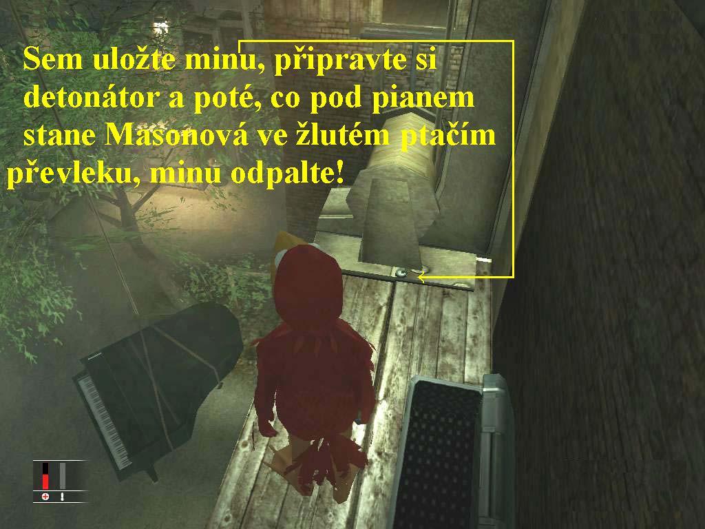 Průvodu, pořádanému u příležitosti masopustního úterý, se zúčastní i americký ministr vnitra, na kterého tam čekají atentátnicí. Bohužel se neví, kdo má být jeho najatým vrahem, takže budete muset zlikvidovat všechny podezřelé osoby, které by mohly mít s atentátem něco společného. Jedná se o vůdce skupiny je Mark Purayah a společníky Raymonda Kulinského a Angelinu Masonovou. Kulinský je při tom bývalý biatlonista, takže by to mohl být muž činu, Masonová má s největší pravděpodobností na starosti průzkum a podporu celé akce. Oba spolu udržují pohlavní poměr a jsou velice nervově labilní, takže lze očekávat prudkou násilnou reakci, poté co se jeden z nich dozví o smrti druhého. Místo jejich pobytu je neznámé, ale objevilo se místo za platbu za provedenou akci, což by mohlo být vodítkem k jejich vypátrání. Na místě se nachází množství civilistů a jelikož se jedná o vraždu významného státníka, bude zde přítomno s velikou pravděpodobností i několik podpůrných jednotek, takže buďte ještě diskrétnější a obezřetnější, než obvykle. Ideální cesta po ocitnutí v reále je připravit si smrtící injekci a jakmile si maska v červeném ptačím obleku a s kufříkem ruce pokecá v recepci, vydat se za ní. Zde se generuje hra pokaždé jinak a jakmile se z hotelu vydá doprava, potom raději hru restartujte a počkejte, až se po novém restartu vydá doleva. Sledujte masku v patách a vyčkejte, až z rušné ulice vstoupí do tmavé boční uličky vlevo a tam ji v temném koutě injekcí usmrťte. Převlečte se do jejího oděvu a mrtvé tělo odtáhněte doleva přes dveře, za nimi vpravo do dveří a zde ho uložte v místnosti pro popelnice. Poté se vraťte, seberte kufřík a vyjděte protější uličkou ven, odbočte vlevo, nato vpravo a hnedle doleva, jděte vpřed. Tak dojdete až k masce ve žlutém ptačím převleku, promluvte si s ní a projděte dveřmi. Vystoupejte nahoru po točitých schodech, vejděte do dveří a kufřík s diamanty položte muži za stolek, má černý ptačí oděv bez masky na obličeji, je to organizátor a vůdce celé akce Mark Purayah. Počkejte si, až si pokecá přes vysílačku s jeho kumpány a jakmile místnost opustí maska ve žlutém převleku, vyčkejte až si stoupne před balkón a několika ranami pěstí ho přehoďte přes balkónové zábradlí, seberte z podlahy vysílačku, kterou upustil. Seberte kufřík s diamanty a rovněž ho přehoďte přes zábradlí dolů do ulice, neboť s kufříkem v ruce byste se ven nedostali. Sejděte dolů zpět na ulici a popadněte kufřík dřív, než vám ho někdo z opeřených masek, nebo nějaký policajt seberou, nyní máte kontakt se zbývajícími dvěma atentátníky, takže lehce podle mapy zjistíte jejich lokalizaci. Pokračujte do uličky přímo naproti, kde po bednách, klecích a chatrném schodišti se přešplhejte až ke kladce, na jejímž laně je přivázán klavír. Pod kladku umístěte minu a připravte si detonátor. Jakmile se dole ve dvoře objeví maska ve žlutém ptačím obleku, což je Masonová, použijte detonátor0000007270_n05.jpg (120713 bytes) (obr.5), tak piano spadne Masonové na hlavu a je z ní placek, teď jste ji zabránili podřezat politikovi hrdlo. Tím jste ovšem neskončili, musíte zlikvidovat ještě třetího atentátníka, který se chystá na ministra s odstřelující puškou. Nyní musíte najít jeden z barů, i zde se hra generuje pokaždé jinak, takže si ten pravý musíte najít sami, já jsem svůj poslední úkol plnila v Blues Baru. V ptačí masce vás ale do baru Blues Bar (můžete lumpa hledat i v Salsa Bar, nebo Rock Bar) hlavním vchodem nevpustí, takže se tam musíte dostat zadními dveřmi. Přes kuchyň se dostanete ke schodům, pokud se podíváte nahoru, zjistíte, že tu číšník pohlavně oblažuje jednu dámu z hostů. Hoďte tedy po nich mincí z inventáře a rychle se schovejte do skříně, poté vyčkejte, až oba vámi vyrušení, kterým jste přetrhli jejich úporné snažení, sejdou ze schodů dolů. Jakmile bude vzduch čistý, vypáčte dveře a vyčkejte, až se odstřelovač vzdálí od své pušky, kterou nechal opřenou o zeď, seberte ji a schovejte se. Jakmile se přiblíží jím vyhlížený cíl na dostřel, zpanikaří a počne pobíhat sem a tam, hledajíc svoji pušku. Ve zmatku zamíří ke schodišti, přikraďte se za ním a shoďte ho ze schodů, měl by se při pádu zabít. Jeho tělo ukryjte pod schodiště a bar opusťte únikovým požárním schodištěm. Teď jste tedy zlikvidovali i třetího potencionálního atentátníka Raymonda Kulinského, takže si to s kufříkem v ruce, který jste ze strachu o ztrátu diamantů nikde neodložili, útěkem přes požární únikové schodiště misi zakončíte. Pokud by se tak nestalo, i tady si hra totiž tak trochu ráda zalaškuje, potom se vraťte na místo, kde jste odložili vaše šaty a převlečte se do nich, poté misi již mnou popsanou cestou opustíte.