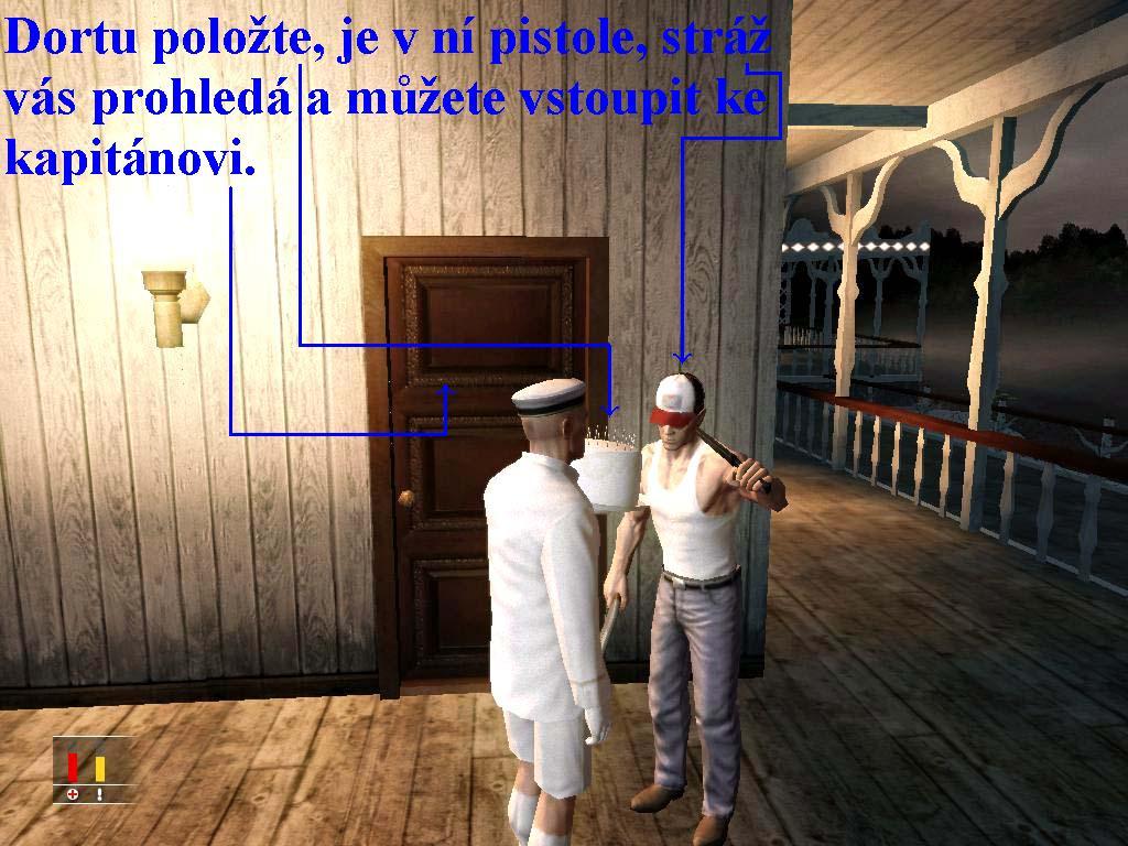 Takže jste se ocitli v Mississippi a máte před sebou další těžké a nebezpečné úkoly. Místní gang, vystupující pod pseudonymem Aligátoři, řídí a organizují distribuci drog po celé Mississippi. Na přepravu tohoto nelegálního zboží využívají drze místní říční dopravu. Bude tedy nutné zlikvidovat tento velice nebezpečný, agresivní a těch nejodpornějších zločinů se neštítící šesti členný gang, včetně jejich Bosse. Budete muset najít a sebrat veškerou bossovu dokumentaci, která dokazuje a mapuje celou jeho nekalou činnost. Ta je ukryta někde na horní palubě v trezoru, ale přesné místo není známo. Ostatní členové gangu se nacházejí na různých místech obou horních palub, no přístup na tyto paluby je silně omezený. Další a podrobnější informace bohužel nejsou známy, budete tedy opět úspěch akce závislý na vaší statečnosti, obratnosti a důvtipu. Jakmile se ocitnete na palubě lodi, popojděte doleva vpřed a na pravé straně poškoďte elektrickou rozvodnou skříňku. Poté jděte kousek dál, vpravo vyběhněte nahoru po schodech, zabočte vpravo a vstupte do dveří. Na stole u rádia je postavena láhev s alkoholem, sem chodí občas námořník se „osvěžit“, naplňte ji tedy sedativy z injekce a rychle se schovejte do skříně. Počkejte, až se ochlasta přijde napít, trpělivě vyčkejte ve skříni, jakmile začne chropět, pak skříň opusťte, převlečte se do jeho uniformy a seberte i jeho zbraň. Ze stolku seberte klíč, mrtvolu nemusíte nikam ukrývat, stačí jen, když před odchodem z místnosti zhasnete světlo. Vyjděte z místnosti a klíčem si otevřete protější dveře, jděte na konec, kde slezte dolů po žebříku, zde se nemusíte ničeho obávat, neboť dělníci pracují se sluchátky na uších, jděte dopředu a muže zaujatě pozorujícího chod stroje pod ním přehoďte přes zábradlí, zbavili jste se tak prvního gaunera. Přes dveře a po schodišti vyjděte na druhou palubu, tuto pouze projděte k dalšímu schodišti, vystoupejte po něm nahoru. Pokračujte vpřed, po chvíli narazíte na objímající se dvojici, kterým vaše přítomnost nevyhovuje a tak oba odejdou do pokoje. Po chvíli žena odejde, vy počkejte až vyjde ven z pokoje i muž, kterého následujte tak dlouho, dokud nedojde k zábradlí a zde si zapálí cigaretu, v tu chvíli ho přehoďte přes zábradlí, teď jste zlikvidovali druhého gangstera. Pokud by se zde nalézala korpulentní dáma, vyčkejte až odejde a poté teprve zmíněný čin proveďte. Vlevo od místa, kde jste přehodili přes palubu darebáka přelezte zábradlí a jděte dopředu, přes další zábradlí se dostanete před dřevěné brlení, po kterém vylezte nahoru o patro výš. Jděte až na samotnou záď lodi a jakmile spatříte chlapíka opřeného o zábradlí, tak i jemu pomozte do vodních hlubin, třetí gauner je na onom světě. Vraťte se zpět, po brlení slezte dolů, vstupte do prvních dveří vlevo, po vstupu do místnosti ihned zhasněte světlo. Projděte kuchyní, poté protějšími dveřmi do chodby a vstupte do prvních dveří vlevo. V místnosti na zemi u skříně leží uniforma elitního číšníka, takže neváhejte a převlečte se do ní. Teď se již nemusíte ničeho obávat a tak se suverénně vraťte do kuchyně, jděte k dortu a vložte do něj pistoli sub-gun, dort seberte a vyjděte s ním ven. Jděte na záď, kde po schodech vystoupejte až na nejvyšší patro lodě, jděte ke strážci, můžete, ale nemusíte dortu odložit, budete však každopádně vyzvání, abyste odevzdali zbraně, učiňte tak, ta ukrytá v dortu vám bohatě stačí0000007270_n07.jpg (146851 bytes) (obr.7). Projděte dveřmi a jděte ke kapitánovi, který se nachází v pokoji se zapnutou televizí. Nyní musíte být rychlí, obezřetní a velice obratní, poté co jeden z členů gangu projde pokojen a vyjde druhými dveřmi ven, kapitán se přesune ke svému oblíbenému bublinkovému sektu. V tu chvíli položte dort na stůl a vyndejte z něj pistoli a rychle si vezměte kapitána jako živý štít. Projděte s ním levými dveřmi do jeho pokoje, kde ho omračte. Seberte mu klíče, z trezoru seberte obálku s fotografiemi, klíčem si odemkněte další dveře a projděte jimi, číšníka klidně hoďte přes zábradlí rybám. Vraťte se pro omráčené tělo kapitána a bez váhání ho rovněž přehoďte přes zábradlí do vody. Nyní vám zbývá ještě zlikvidovat poslední tři členy bandy, jeden z nich se po nějaké chvilce objeví, ukryjte se tedy za roh a jakmile si u zábradlí zapálí cigaretu, přehoďte ho rovněž přes zábradlí do vody. Teď se vydejte kolem palubního zábradlí až k přením dveřím a u nich počkejte, až předposlední bandita jimi projde dovnitř, vstupte za ním a jakmile se opře o zeď zády k vám, připravte si pistoli a vezměte si ho jako živý štít. Doveďte ho takto k zábradlí, kde ho bez váhání srazte dolů. Nyní se vraťte k hlavnímu vchodu a jakmile poslední gangster půjde na druhou stranu k zábradlí, opět s pistolí v ruce ho zajměte a doveďte ho k protějšímu zábradlí, kde ho rovněž srazte do vody. Jistě víte, kde jste zanechali váš oblek, vydejte se tudíž pro něj, převlečte se do svých šatů a vraťte se zpět na třetí palubu do chodby, kde jste se potkali s prvním členem bandy s jeho milenkou. Zhruba uprostřed této chodby je vstup do prostoru, označený jako pouze pro zaměstnance. Vstupte tam, ze stolu seberte razantní pušku FN-2000, schovejte ji do kufříku, kufr seberte a vyjděte zpět na chodbu, známou cestou se vraťte až dolů, kde jste začínali a přistupte k jednomu ze záchranných člunů, nastupte si a tím misi zakončíte.