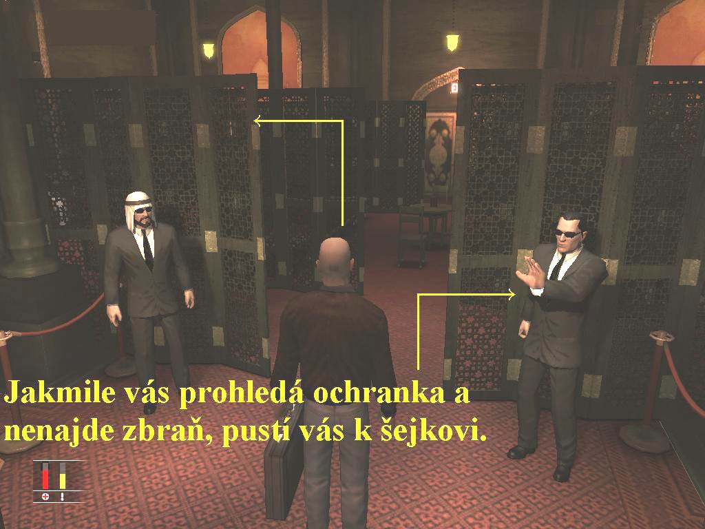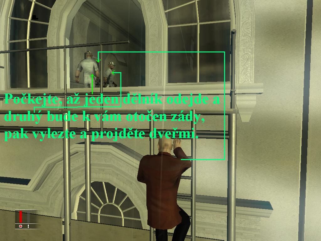 První mise plní roli nenuceného tutoriálu, ve kterém se dozvíte vše důležité o ovládacích prvcích, možnostech hry a osvojíte si vše potřebné. Samotná hra je na první pohled totožná s předchozím Contracts a v podstatě se všemi ostatními díly.0000007270_n00.jpg (38124 bytes) (obr.Úvod) Opět je možnost zvolit si úhel kamery, pohled z první osoby sice umožní pohled na zbraň a chodidla, ale vždy při jakékoliv složitější aktivitě typu škrcení nepřátel či vylézání na vyvýšené předměty se kamera přepne na okamžik do pohledu třetí osoby a zase zpět. Blood Money však nabízí vždy více možností k vyřešení daného úkolu, je jen a pouze na fantazii a rozhodnutí hráče, jak se vypořádá s právě nastalým problémem. First person pohled je vhodný pro akčněji zaměřené hráče, lépe se v něm míří a pocit zúčastnění se přestřelky je intenzivnější. Pokud však budete hrát hru jako stealth akci, stane se third person výhled vaším nejdůležitějším parťákem. Nejenom, že máte lepší přehled, u jaké postavy budíte největší pozornost, ale můžete snadno odhadnout viditelnost vaší postavy i na vzdálenější horizont. Lépe se tak schováte za libovolnou překážku a útoky zpoza úkrytu se stávají více smrtícími. Co musíme novému Hitmanovi přičíst k dobru, je perfektní design levelů. Ty jsou nejenom svojí rozsáhlostí opravdu velké, ale též členité a vždy nabízejí spoustu alternativních cest ke zvolené destinaci. Při pohybu v nich máte opravdu pocit, že se procházíte v reálném světě. Například při misi v Pařížské Opeře máte opravdu pocit, že se jedná o věrohodnou kopii reálné stavby, podobně se budete cítit na karnevalu v Mardi Gras v New Orleans, kde budete svědky několika desítek pohybujících se postav. Toho se dočkáte pouze při efektu obrazu v obraze, který hra používá například při znázornění odhalení vámi zabitého nepřítele. Při kradmém postupu vám přijde velmi vhod i ukazatel podezření, umístěný vedle klasického ukazatele zdraví. Agent 47 by nikdy nedovedl svoje dílo k dokonalosti bez přítomnosti obsáhlého zbrojního arzenálu. I v Blood Money se tak dočkáte velkého počtu oblíbených pomůcek plešatého zabijáka, včetně oblíbené pistole, brokovnice, automatických i poloautomatických kulometů, či odstřelující pušky. Samozřejmě nesmějí chybět ani oblíbené zbraně na blízko včetně oblíbené škrtící struny, nožů, či improvizačního kladívka. Nově v Blood Money získáváte za splněné úkoly finanční hotovost, za kterou si po splnění mise můžete pořídit nové kousky do svého arzenálu. Snad jen malý dodatek, vzhledem k tomu, že podle návodů hrají jen začátečníci, nebo méně zkušení hráči, je tento návod napsán na hraní v nejlehčí obtížnosti, i tak jde o velice obtížnou hru. Navíc vám popisuji vždy jen tu ideální cestu vpřed, alternativních možností je daleko více, no jistě po čase přijdete i na mnohé další postupy.