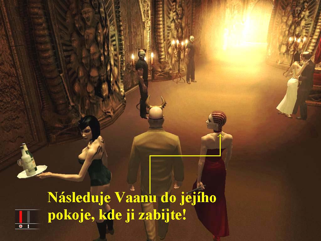 V této misi vás čekají dva úkoly, tedy najít a zlikvidovat dva cíle. Prvním z nich je Vaana Ketlyn, bývalá rumunská cirkusová umělkyně, která má hlavní podíl na celosvětovém černém trhu, druhým je Antony Martinez, příslušník CIA, který to tak říkajíc táhne s oběma znepřátelenými stranami, zkrátka řečeno je to chameleón. Ketlyn pořádá maškarní ples v klubu Shark ve Pegas, kde bude přítomný i Martinez, aby spolu uzavřeli výhodnou dohodu. O vaší přítomnosti ale oba vědí, jelikož jste posledním živým příslušníkem skupiny 47, zjistěte kdo odrovnal všechny příslušníky skupiny 47, zlikvidujte oba cíle a navíc každého, kdo si vás vezme na mušku, byli jste doposud skvělými agenty, tak si to na poslední chvíli nepokazte, splňte i tento úkol jako vždy bezezbytku. Vydejte se dopředu a prosklenými dveřmi vstupte na recepci, promluvte si s policajtem, nakukáte mu, že tady měl pro vás někdo nechat balíček. Jakmile se půjde dozadu podívat do poslední místnosti, složte ho sedativy a převlečte se do jeho uniformy, vyjděte zpět na ulici, odbočte doleva. O kousek dál vlevo je vchod do garáží, vpravo je strážnice. Vstupte dovnitř, jakmile se na vás policajti nebudou dívat, seberte z videa bezpečnostní kazetu a vyjděte ven, odbočte vpravo a seběhněte dolů do garáží. Na konci vpravo v rohu je dodávkový automobil, u zadních dveří leží bílý kostým pro účastníky párty v nebi, převlečte se do něj. O kousek dál jsou dva výtahy, vstup do nich hlídá ochranka. Levým výtahem se sjíždí dolů na párty v Pekle, pravým potom nahoru na párty v Nebi. Jděte tedy k pravému výtahu, ochranka vás požádá, abyste odevzdali zbraně, jakmile tak učiníte, vstupte do výtahu a vyjeďte nahoru. Protějšími dveřmi vstupte do sálu s bavícími se hosty, na konci vlevo je záchod, do kterého vstupte. Občas sem chodí Martinez čůrat, takže si počkejte, až vejde do jedné z kabinek a v ní ho nakrmte z injekční stříkačky sedativy, ale zavírejte za sebou dveře, neboť sem často chodí kuchař a číšníci. Převlečte se do Martinezovy masky, seberte mu zbraň a kufřík a nepozorovaně toalety opusťte. V masce Martineze máte přístup kamkoliv, takže se vraťte do sálu, vyčkejte, až zpěvačka Eva dozpívá a pozve vás do sálu, následujte ji. Uvnitř se na vás pokusí zaútočit nožem, předejděte ji a pošlete ji na onen svět, nůž můžete samozřejmě sebrat. Přistupte k notebooku, aktivujte ho a tak se vám na monitoru ukáží tváře dalších vrahů, majících na vás spadeno. Nakonec seberte ještě speciální pušku, nyní se můžete vrátit zpět k výtahu a sjet do garáží. Během jízdy si vylezte na kabinku výtahu a počkejte, až dole zastaví. Přelezte si do druhé výtahové šachty, otvorem seskočte dolů a vyjděte dveřmi ven, projděte dveřmi vlevo. Tento manévr jste museli udělat proto, že kdybyste v garážích vystoupili a chtěli jet levým výtahem do Pekla, museli bysta ochrance opět odevzdat zbraně, takto vám ale všechny zůstaly a že se vám za chvíli budou náramně hodit, na to klidně vezměte jed, navíc se ani nemusíte nikde převlékat. Pokračujte dopředu, tak potkáte Vaanu, to je váš další potencionální vrah. Pozve vás do svého pokoje, následuje ji0000007270_n09.jpg (112036 bytes) (obr.9), v pokoji vás požádá, abyste si sundali masku a jakmile odmítnete, pokusí se vás zabít, takže ji předejděte a sejměte ji dříve, než skolí ona vás. Vraťte se zpět a za pultem si promluvte s Maynardem Johnem, to je profesionální vrah, který vás pozná i ve vaší masce a jelikož se domnívá, že je nejlepším střelcem na světě, vyzve vás na střelecký souboj muže proti muži. Následujte ho do zvukotěsné místnosti, máte u sebe zbraně a nějaké jsou ještě v místnosti na různých místech. Dobře se kryjte a při první příležitosti ho zastřelte, pokud použijete samopal, je jeho likvidace dílem okamžiku. Jděte k jeho mrtvole a seberte mu elektronickou kartu, pomocí ní si otevřete dveře vedoucí z místnosti na chodbu a výtahem vyjeďte zpět do garáží.Vydejte se zpět na místo, kde jste zanechali váš původní oblek a kufříkem s vněm ukrytou speciální puškou se rychle vraťte zpět do garáží, kde nasedněte do dodávkového auta, v něm misi zakončíte.