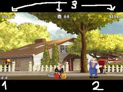 Popis hry: Váš Ăşkol je jasnĂ˝, roli šĂlenĂ©ho muĹľe s motorovou pilou v ruce musĂte rozĹ™ezat vše, co se dá. Ale aĹľ tak jednoduchĂ© to nenĂ, stále vás totiĹľ pronásleduje obtloustlĂ˝ opravář s kladĂvkem v ruce a pokud vás doĹľene, jste synem smrti. Na jedno kolo máte takĂ© ÄŤasovĂ© omezenĂ, pokud však ÄŤas vypršĂ, nestane se nic hroznĂ©ho. MĹŻĹľete level bez problĂ©mu dohrát, ale k opraváři pĹ™ibude i jeho rychlejšà žena, která se vás snažà takĂ© zastavit. Hra je takĂ© ztĂĹľená tĂm, Ĺľe nádrĹľ motorovĂ© pily obsahuje jen urÄŤitĂ˝ objem „šťávy,“ a pokud vám dojde, musĂte si ji natankovat z kanystrĹŻ. *Arduška* |