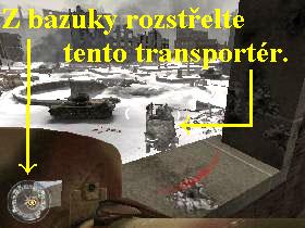 druhý německý tank. Samopalem zlikvidujte německou pěchotu, použijte kouřový