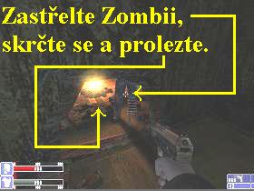 po římse doleva a na konci vstupte do otvoru vpravo, kde ihned zabijte Zombii,