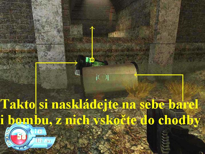 nahoru a při tom půjdete dolů. Hned zespodu postřílejte vojáky a rozstřelte