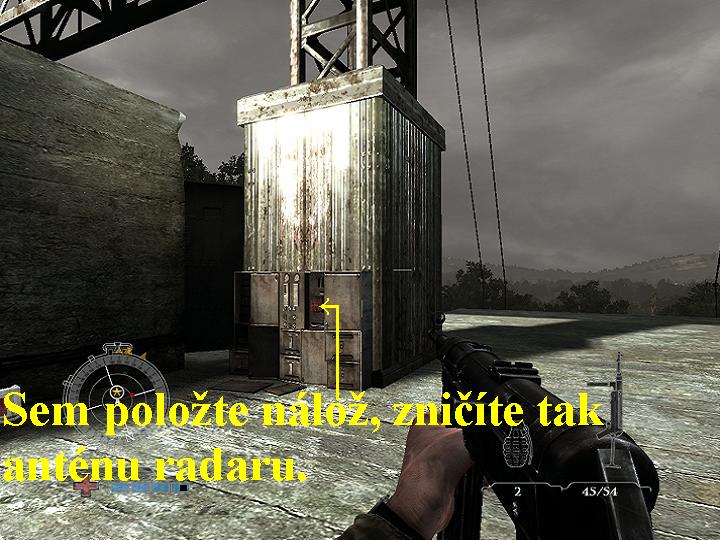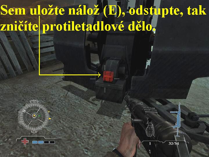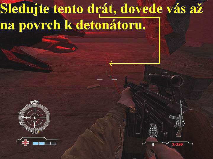 Po skončení obvyklého briefingu a výběru zbraní, z níž se mimo jiné dozvíte, že spojenci právě nyní zahájili válečnou operaci VARSITY, se v reálu ocitnete opět jako výsadkář v letadle společně s několika kamarády. Vašimi novými úkoly jsou nyní další diverzní akce, tedy zajistit bojovou věž, zničit tři děla, čtyři protiletadlová děla, zlikvidovat fašouny ve třech bojových transportérech, zničit ovládání výtahu pro přepravu munice do třetího patra a taktéž zničit ovládání výtahu pro přepravu munice v prvním patře. V reálu však tentokrát ale budete mít velikou smůlu, vaše letadlo bude sestřeleno, přežijete jen vy sami a jen se štěstím se vám na poslední chvíli podaří otevřít padák, přesto se snažte přistát hladce a co nejpřesněji, tak přistanete na vrcholu betonové věže na jednom ze dvou míst, označených zelenými světlicemi. Zde ihned po přistání zjistíte, že zde už bojují výsadkáři pravděpodobně z jiného leteckého paradesantního výsadku. Nejdříve tedy očistěte od fašistů celý povrch věže, především potom likvidujte ty, co střílejí s tarasnic. Poté otevřete dvě veliké bedny, je v nich spousta různé munice a lékárniček. Nyní seběhněte po schodišti o patro níž, kde postupně známým způsobem, tedy přikládáním náloží na červeně vyznačená místa, zlikvidujte tři děla. Jen pozor na to, že zde už kromě řadových vojáků Wehrmachtu bojují i velice zkušení a odolní Esesmani, které musíte vždy před položením náloží napřed do jednoho zlikvidovat. Nato po dalších dvou železných schodištích opět seběhněte o patro níž, i zde napřed proveďte důkladnou očistu. Potom seběhněte po kamenném schodišti o patro níž, pobijte všechny nácky a jděte k červeně nasvícené stěně, kde zmáčkněte zelené tlačítko, tak si přivoláte výtahovou plošinu, nastupte si na ni, aktivujte na ní panel, tak sjedete o něco níž. Vystupte si a postřílejte všechny fašouny, poté vyběhněte po schodišti výš, postřílejte další nácky, v malé místnůstce rozstřílejte z vašich zbraní červeně u zdi poblikávající ovládací zařízení pro přepravu munice do třetího patra, splnili jste úkol. Poté se po schodišti vraťte k výtahu, nastupte, aktivujte panel, vyjedete nahoru, kde si vystupte. Vraťte se na místo, kde jste před chvílí zlikvidovali všechna děla, vyjděte ven a postupně po obvodu přikládáním náloží zničte všechna protiletadlová děla, jen opět pozor na nácky a Esesmany. Poté si po všech schodištích dojděte nahoru, tak naleznete další lékárničky a munici. Jakmile vše posbíráte, jděte zpět k výtahu a nyní sjeďte dolů, vyjděte ven a po dvou žebřících slezte níž. Pokračujte doprava, přeskočte přes mezeru na protější podlážku, odtud po žebříku nahoru a vlevo vstupte do místnosti, kterou nejdříve vyčistěte od fašistů., teprve potom zničte opět z vašich zbraní červeně u zdi poblikávající ovládací zařízení pro přepravu munice do prvního patra, máte splněný další úkol. Poté seběhněte po schodišti o patro níž, zeleným tlačítkem si přivolejte výtah, sjíždějte níž, po cestě likvidujte vás v mezipatrech napadající fašisty a Esesmany. Dole si vystupte, zlikvidujte fašistický výsadek, poté střelce v obrněném transportéru. Vyjděte ven, zabočte doprava, na konci zlikvidujte střelce druhého transportéru. Pokračujte kolem transportéru vpřed, tak dojdete ke třetímu transportéru, zlikvidujte jeho střelce a splnili jste další úkol. Nyní se vracejte zpět a po kramlích a venkovních žebřících si vylezte až do místnosti, v níž se nachází výtah. Nastupte si a vyjeďte v něm nahoru, vyjděte ven a po venkovních žebřících si slezte dolů až do druhého patra, kde už bojují vaši kamarádi s nacisty a Esesmany. Pobijte je všechny do jednoho, vzadu v poslední místnosti se nachází žebřík, po kterém vylezte nahoru, tak se setkáte s dalšími bojujícími kamarády, pomozte jim zlikvidovat všechny útočníky, tak jste splnili další úkol a zároveň jste obdrželi i nový, máte se setkat s kamarády v muničním skladu. Vpravo v rohu se nachází malý výtah, aktivujte tlačítko a sjeďte výtahem dolů, setkáte se s kamarády a splníte další úkol, po krátké animaci jako nový úkol máte nyní utéci před palbou z bojové věže. Utíkejte tedy vpřed čeká vás složitá a klikatá cesta, nejjednodušší je sledovat červený drát na zemi0000008828_n04.jpg (76208 bytes) (obr.4). Musíte se totiž probíjet přes spousty nacistů a bestiálních Esesmanů v plynových maskách, kteří jsou zkušenými a velice těžko zlikvidovatelnými bojovníky, musíte včas odbočovat do stran, skákat a přeskakovat různé překážky, zkrátka cesta vpřed je nejen nebezpečná, ale i velice členitá a těžko by se mi směr vašeho útěku popisoval, takže se držte mé předchozí rady, sledujte a nespouštějte z očí červený drát na podlaze, je to drát vedoucí k detonátoru a spolehlivě vás dovede k cíli. Tak dorazíte až do světlé chodbičky, končící zdí, na které jsou kramle, po kterých si vylezte nahoru, tak se ocitnete na ulici a splnili jste poslední úkol v této operaci i v celé hře. Podle drátu pak jděte k detonátoru, zvedněte ho ze země, nebo pokud je váš inventář plný, vyměňte detonátor za některou vaši zbraň. Poté detonátor levým tlačítkem myši aktivujte a nyní už na vás čeká nádherná závěrečná animace, ve které spatříte výbuch a komplexní destrukci betonové věže. Teď už zbývá si pouze vyslechnout závěrečný komentář a kompletní shrnutí a vyhodnocení všech vašich dosavadních úspěchů ze strany nejvyššího velitele, potěšit se prohlédnutím všech va